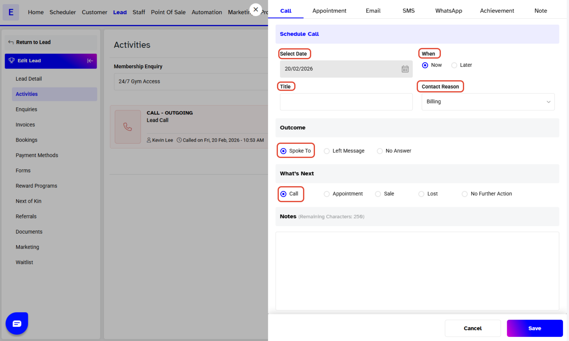 - Outcome: Choose an outcome by selecting: Spoke To, Left Message, or No Answer.