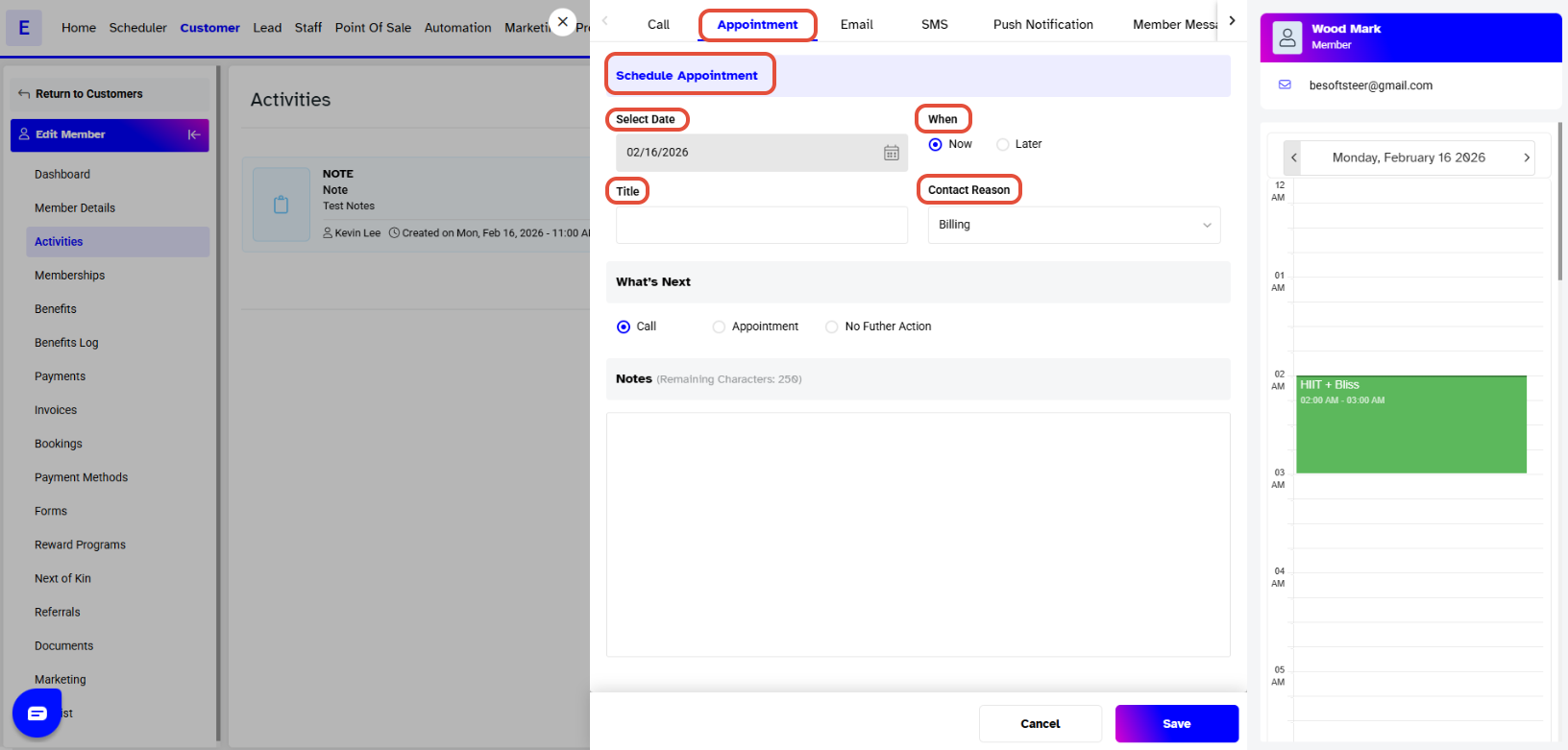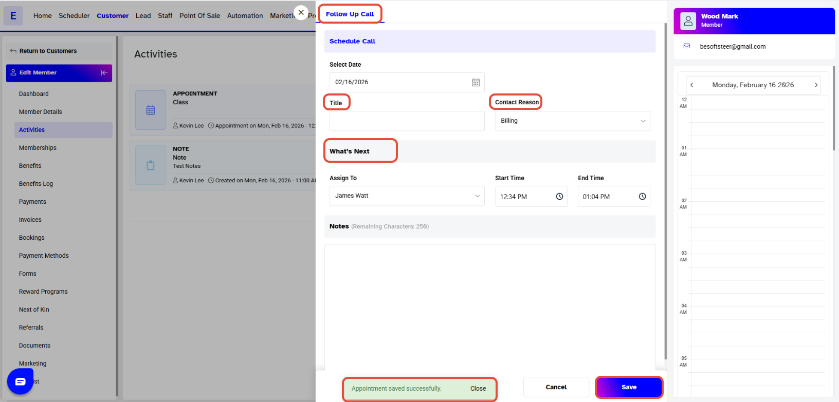 A Follow-Up Appointment window will pop up if your What's Next option was Appointment, where merchants can fill out the necessary and click Save once again. A Follow Up Appointment Saved Successfully message will pop up, confirming your changes.