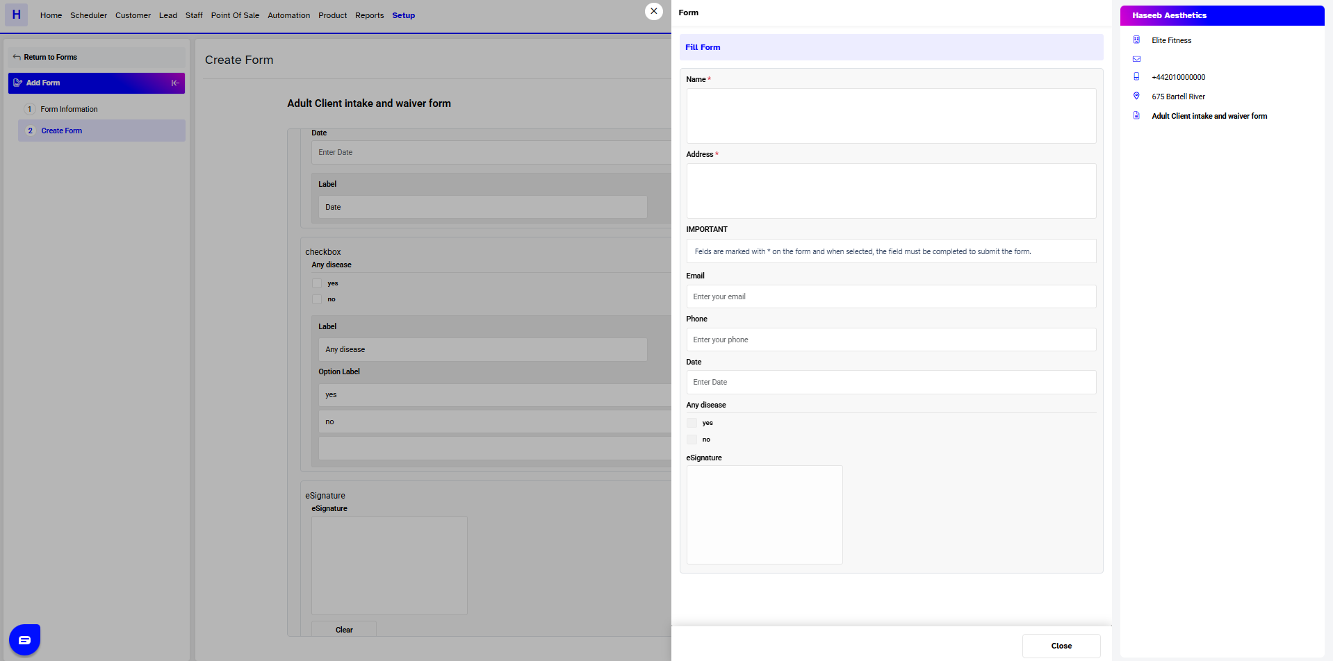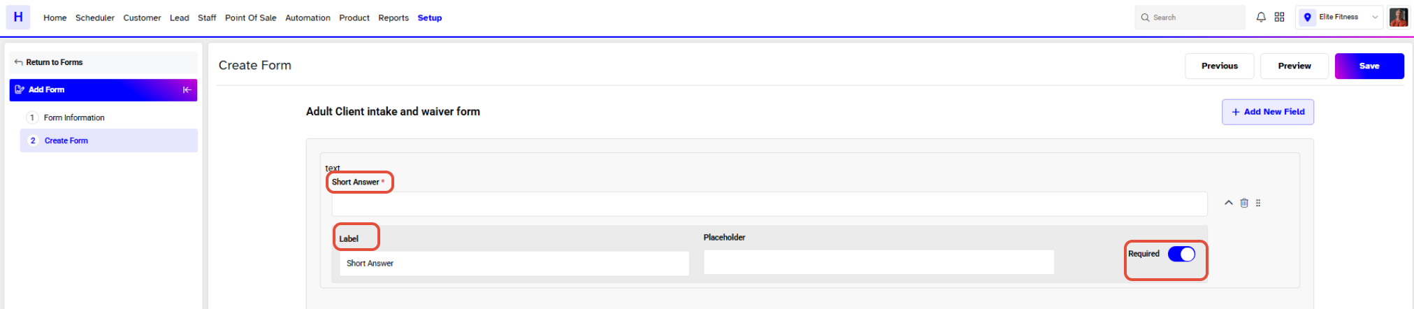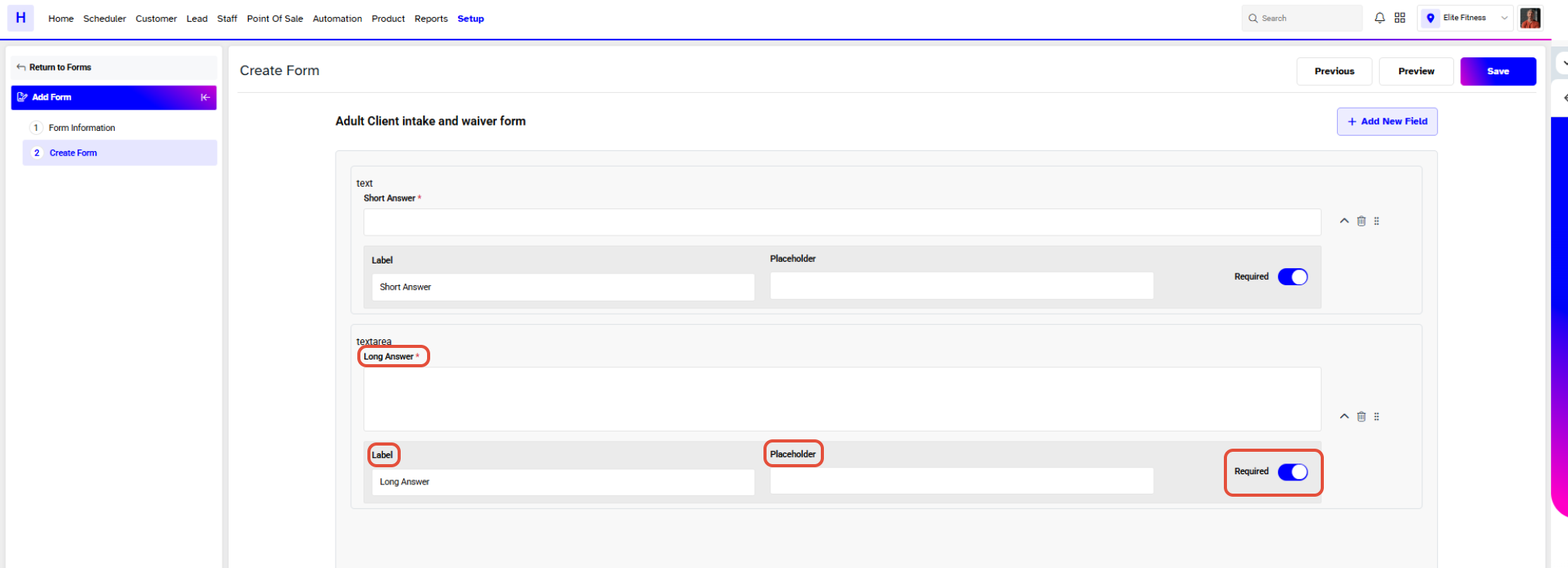 In Core, you can create Forms for many reasons. They can act as a waiver, health questionnaire or provide information to the customer. Each form can be configured with multiple fields.