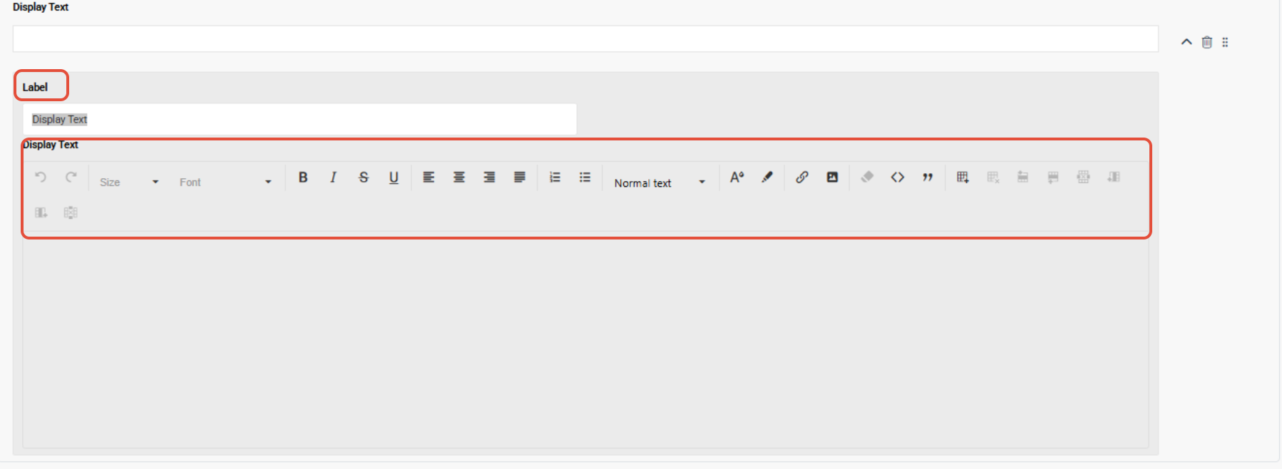 - Display Text: Display text fields allow for the inclusion of text, tables, images, and links. Customize the Display design by selecting colours, fonts, and other styling options from the editing Toolbox.