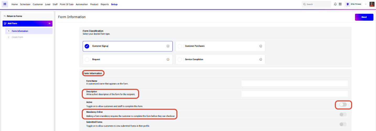 As explained above, these forms will be triggered when customers book or purchase classes, services or products, therefor form ‘name’ and ‘description’ are mandatory fields. These forms offer a number of configurations, such as;