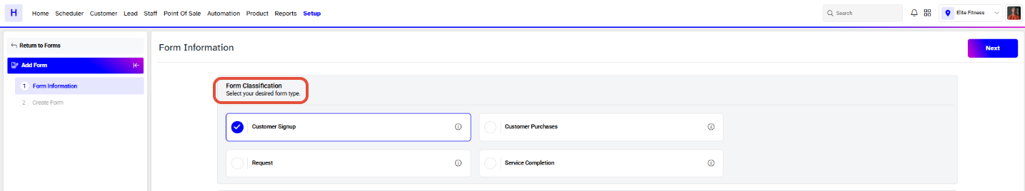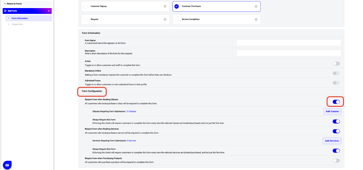 - Require Form upon Customer Purchases: These forms will be triggered when customers book or purchase Classes, Services or Products.