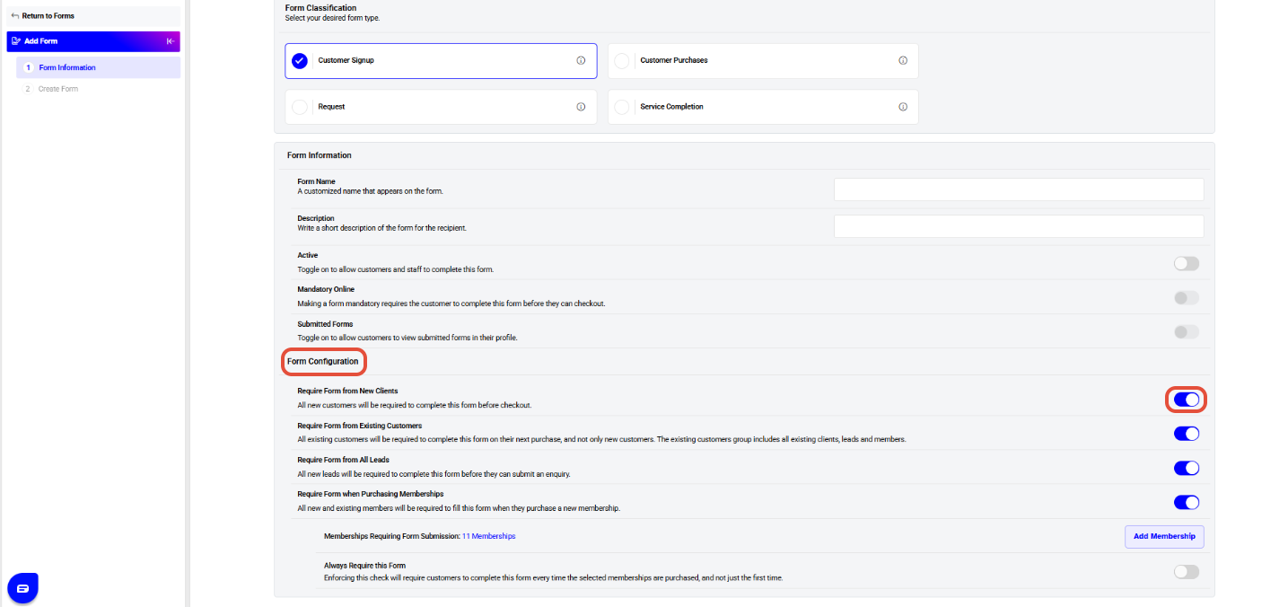 - Require Form upon Customer Signup: These forms will be used for new customers who register with merchants, i.e. they become a Member, Client or Lead.