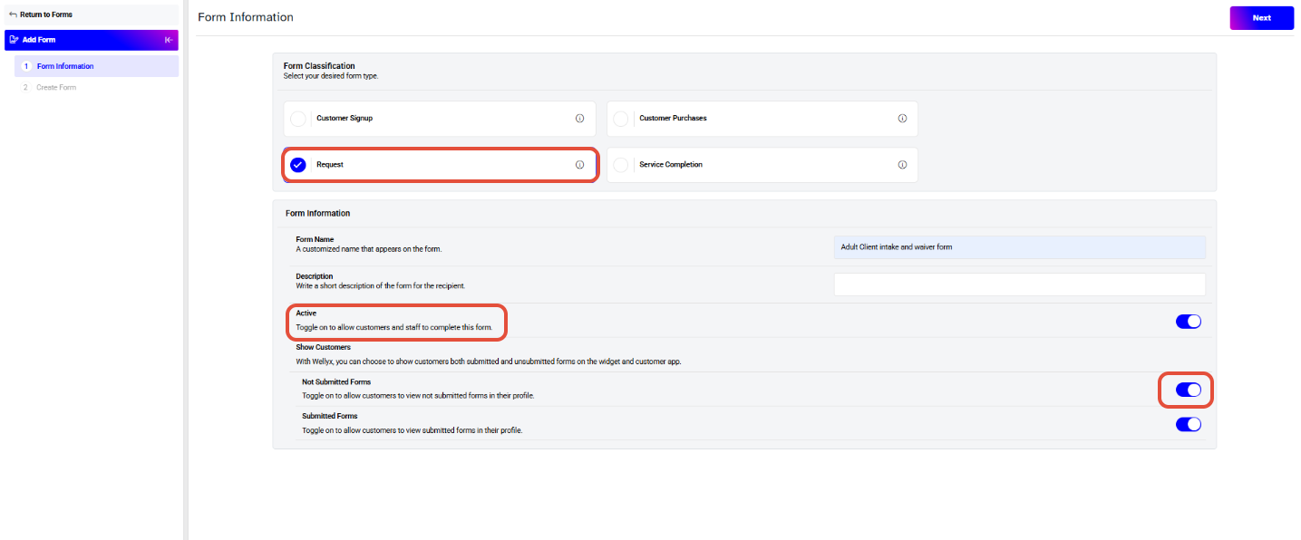 - Toggle on the Submitted Forms Button to allow the Customer to view the Submitted Form in their Profile.