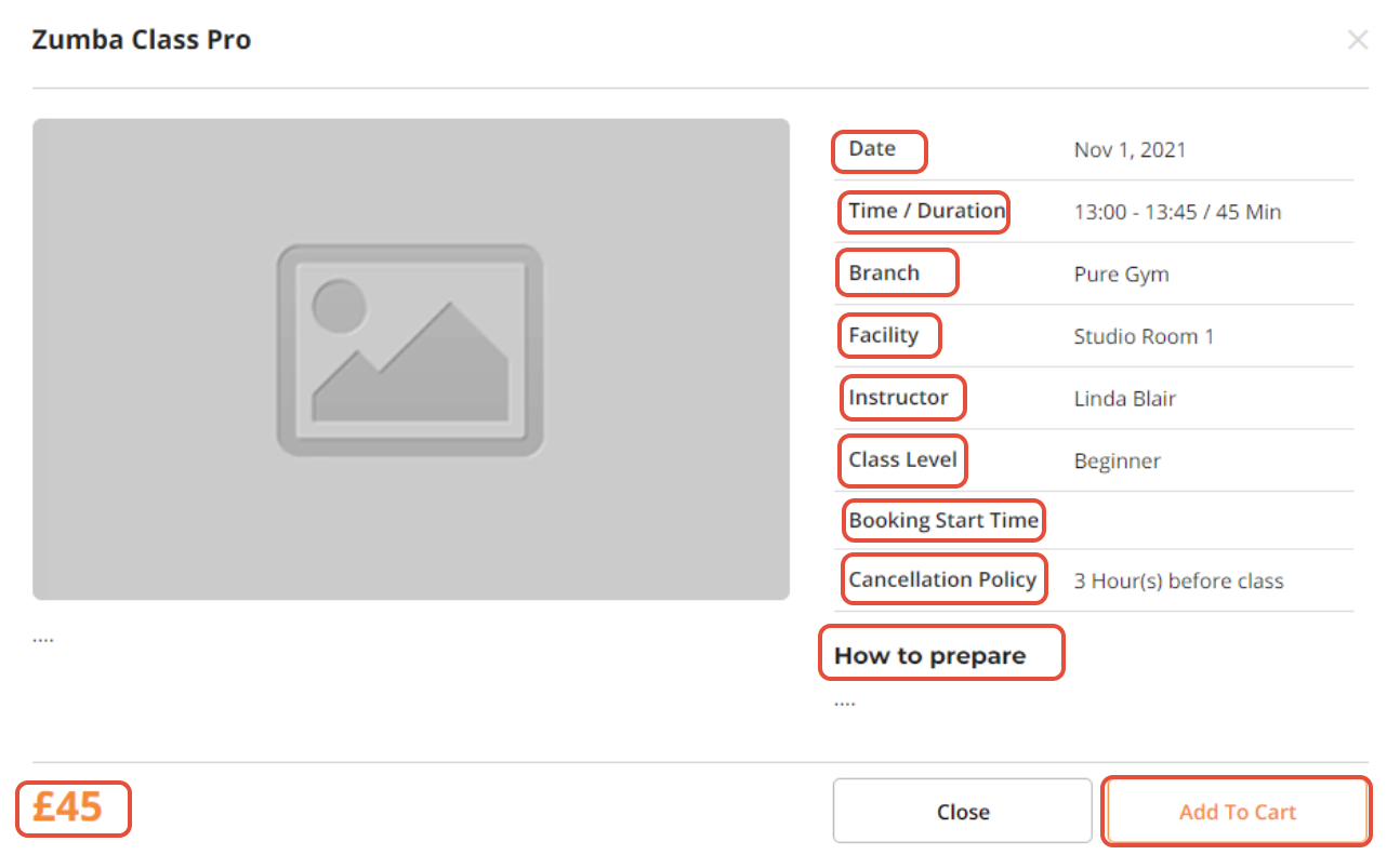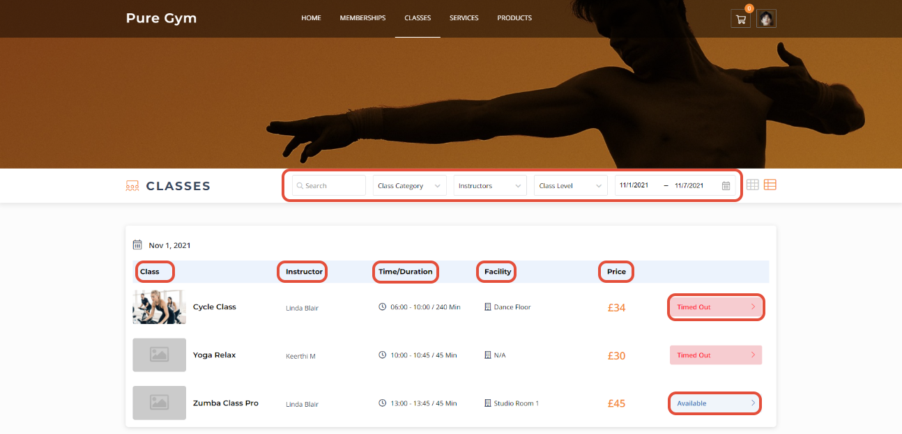 The Classes Tab will display the classes that are scheduled in order of dates. A Search Tab will be present where customers can filter their search for scheduled classes by Class Category, Instructor, Class Level or Date.