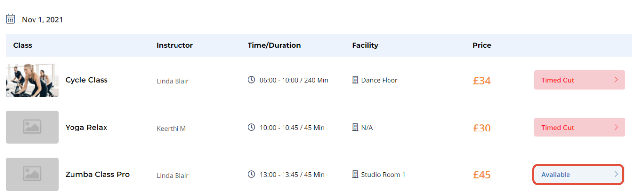 Available will appear in front of the classes that are available for booking.