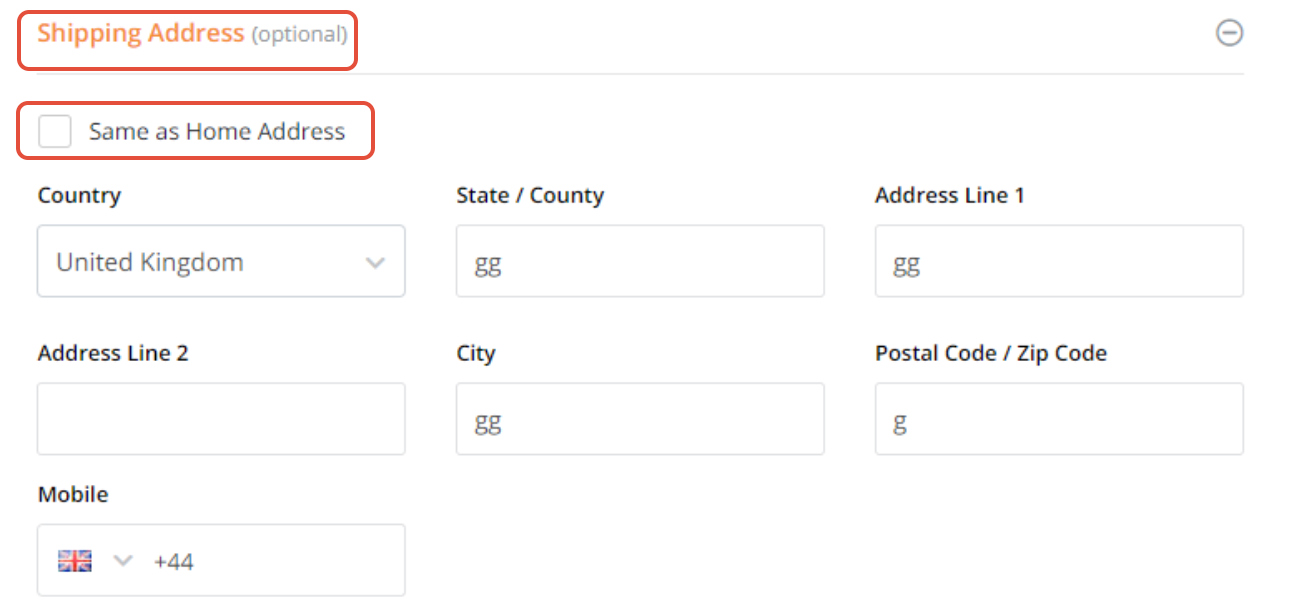 Click on the + icon to view this section. Merchants can check Same as Home Address to auto populate all the fields or enter the relevant information if the Shipping Address is different from Home Address.