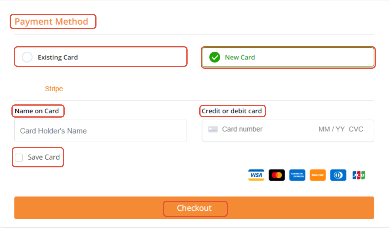 Click on Existing Card if your have saved your card details in your profile. Click on New Card to add a new card. Enter the card holder's name under Name on Card. Add your Debit or Credit Card. Check Save Card to save your card details. Click on Checkout.