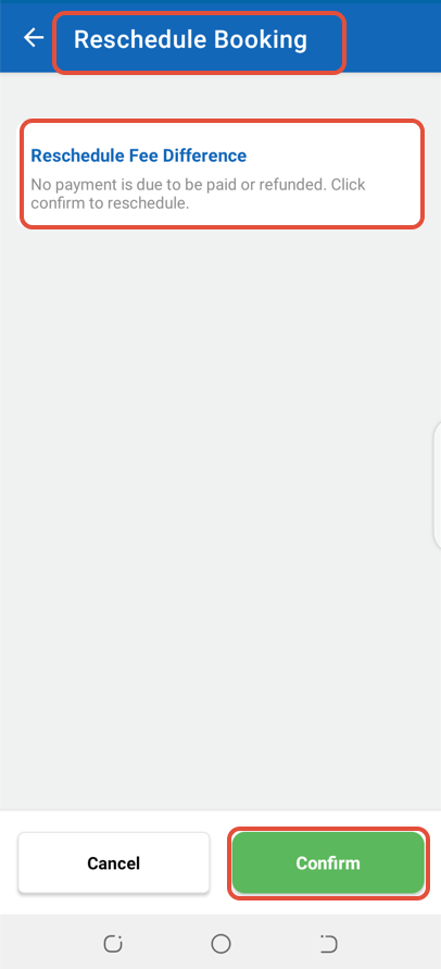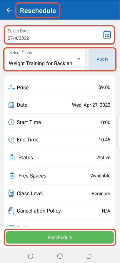 Once in Reschedule Screen, select Date and Class for the Customer. Click on the Reschedule Button to proceed.
