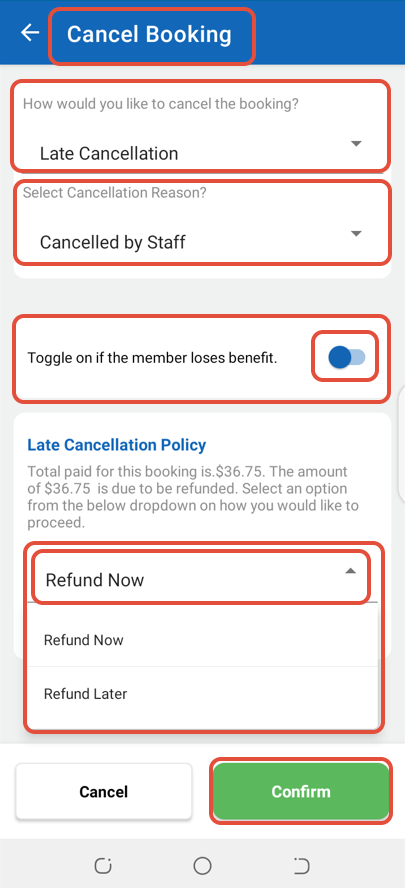 Now, select Late Cancellation and Refund Now from their respective dropdown menus. Once done, click on the Confirm Button to proceed to the next screen.