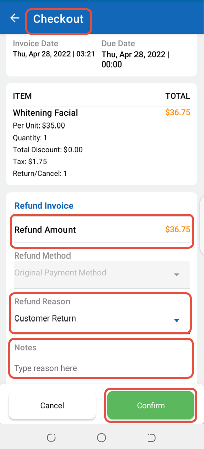 In Checkout, select a Refund Reason and then click on the Confirm Button.