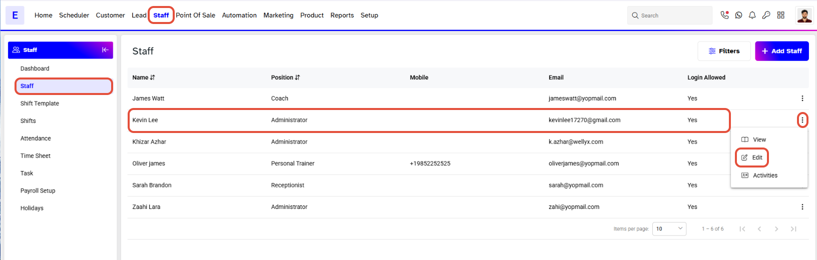 - Click on the Edit Icon against the Staff Member.