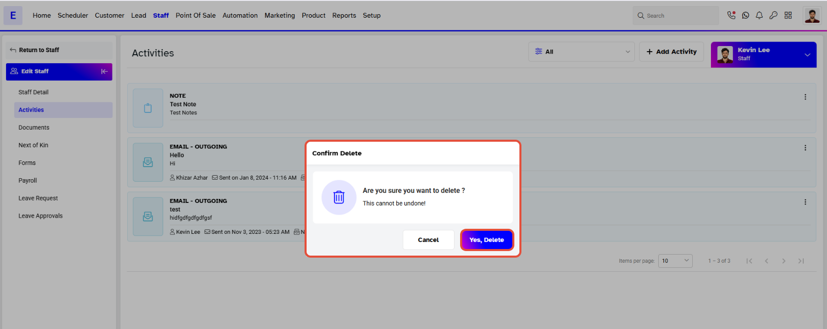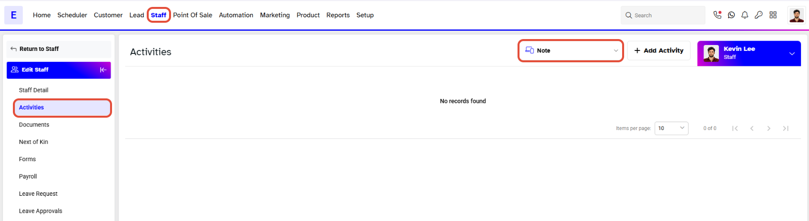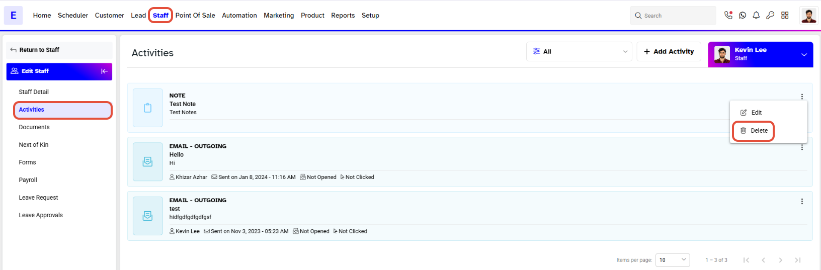 This guide explains how to delete Staff Notes from the Staff Activities section. By following these steps, you can remove specific notes associated with a staff member.Step 1: Navigate to Staff Activities