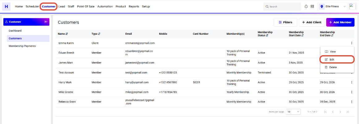 Go to the Customer Module and click on the Edit Icon against the Customer.