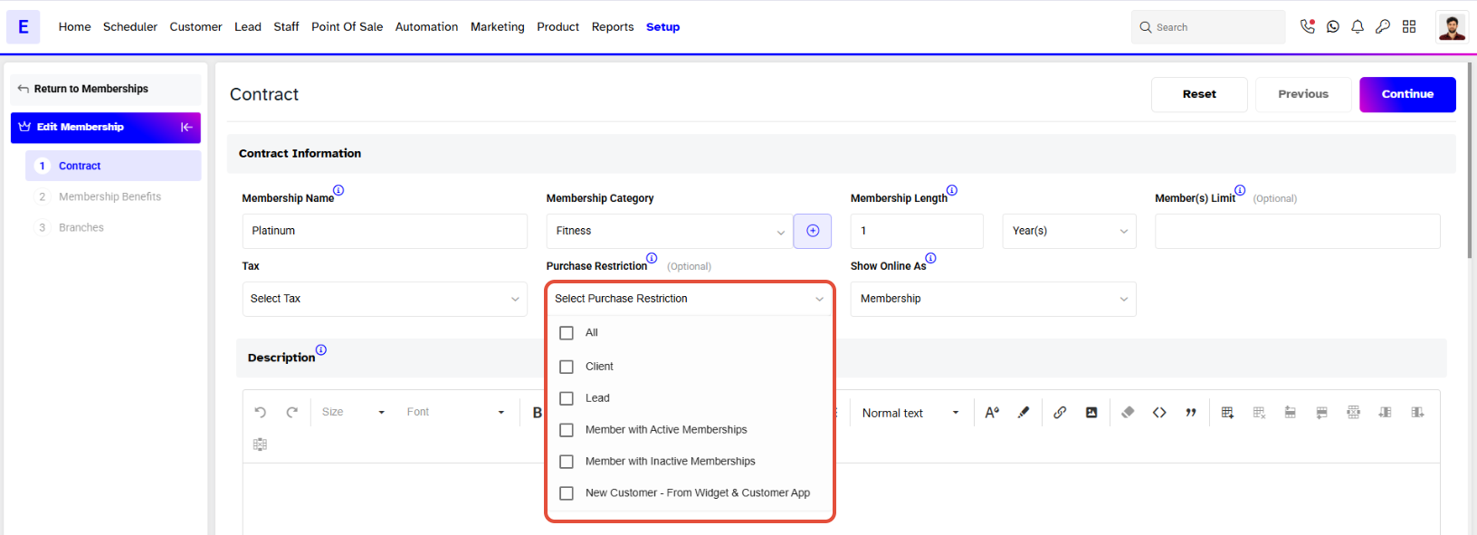 From the Purchase Restriction Dropdown, select the type of Customers that will be restricted from booking this Membership.