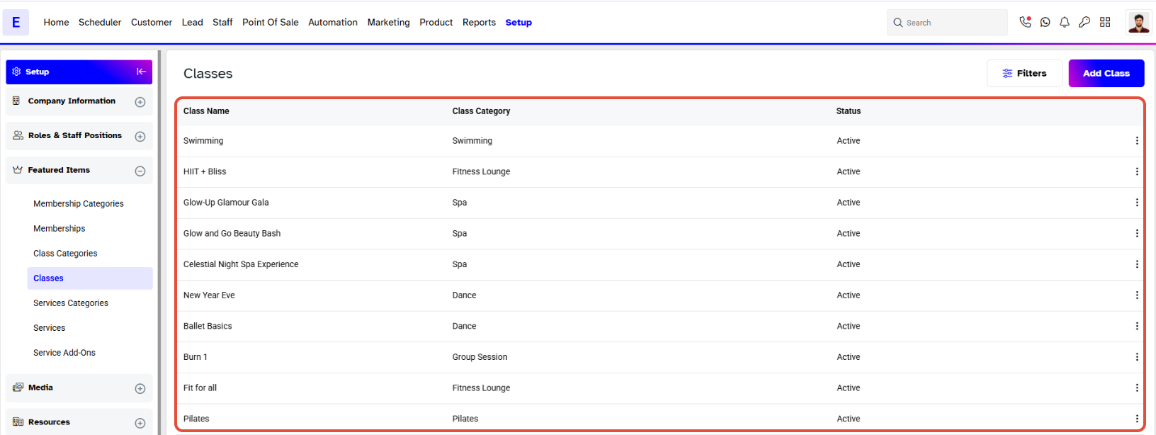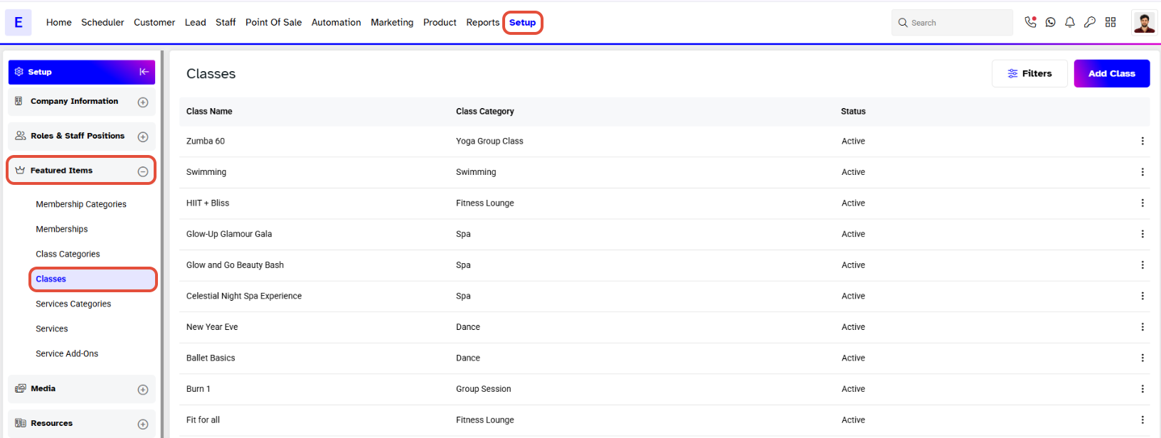 Select Classes from the Featured Items Tab.
