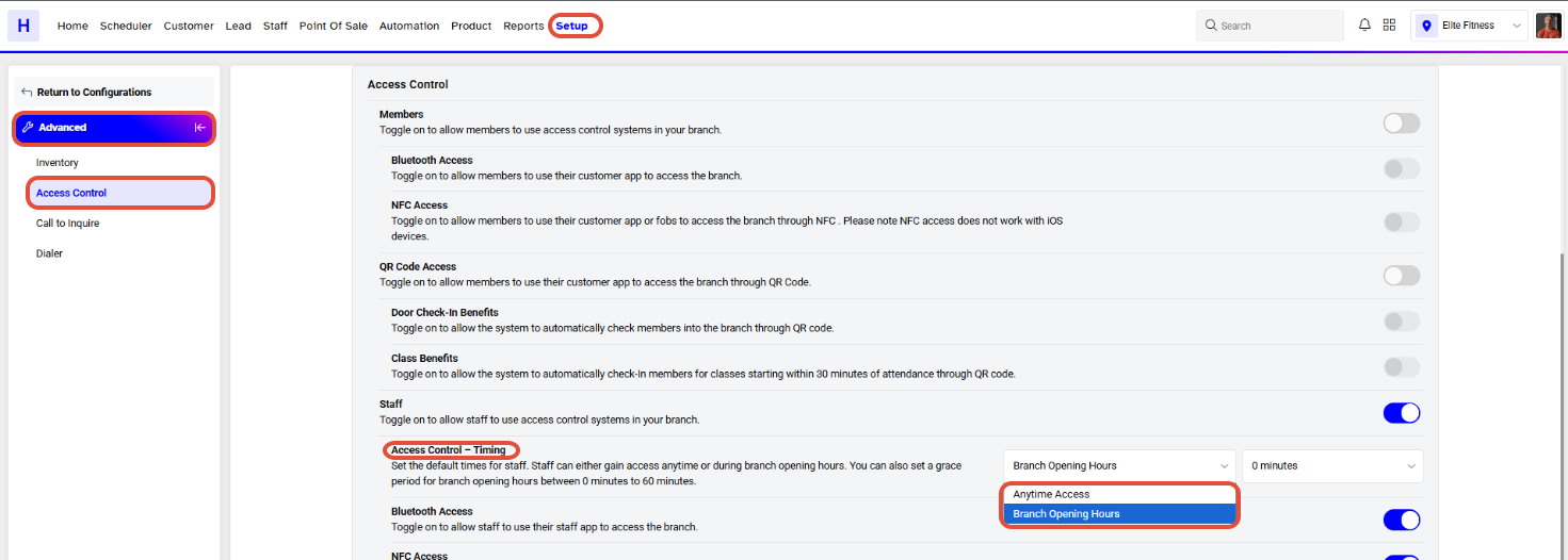 Select between Anytime Access and Branch Opening Hours for the Access Control Timing of the Staff Members.