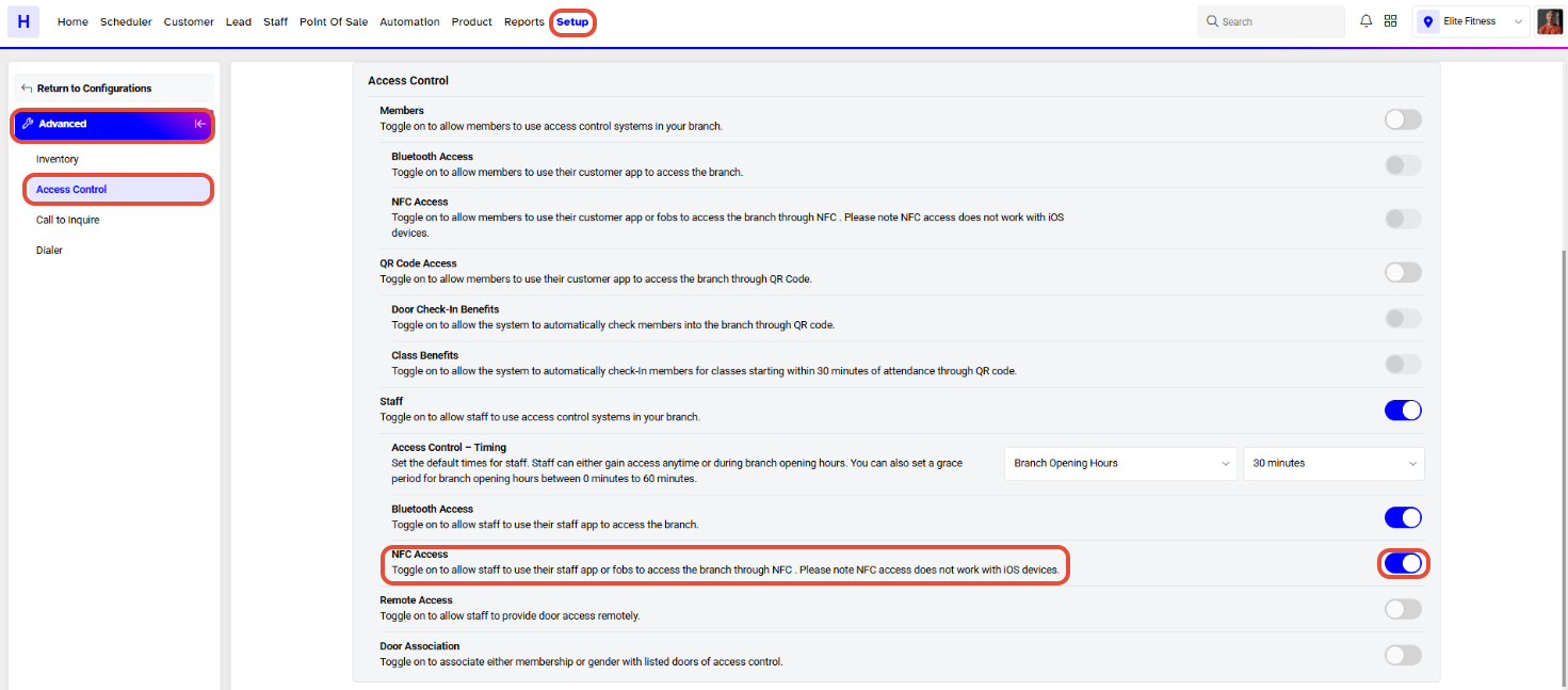 Toggle on the NFC Access Button to allow Members to enter the Branch using NFC.