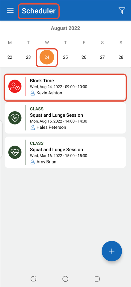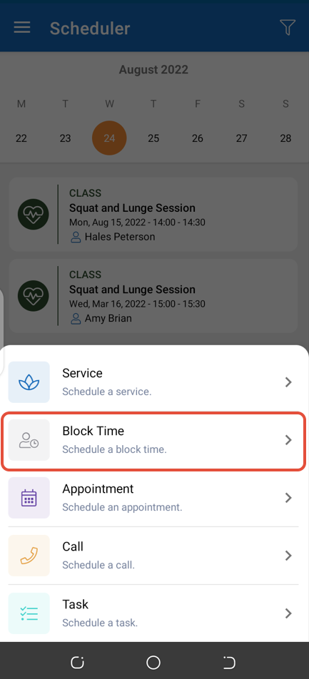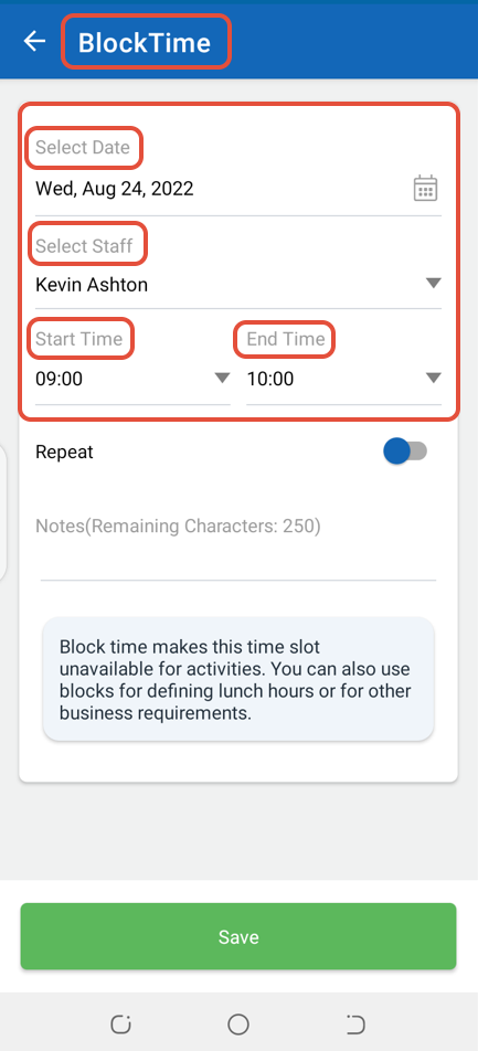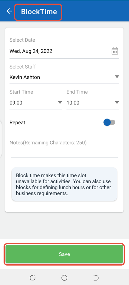Whilst in Block Time Screen, select Date, Staff and Time for the Block Time.