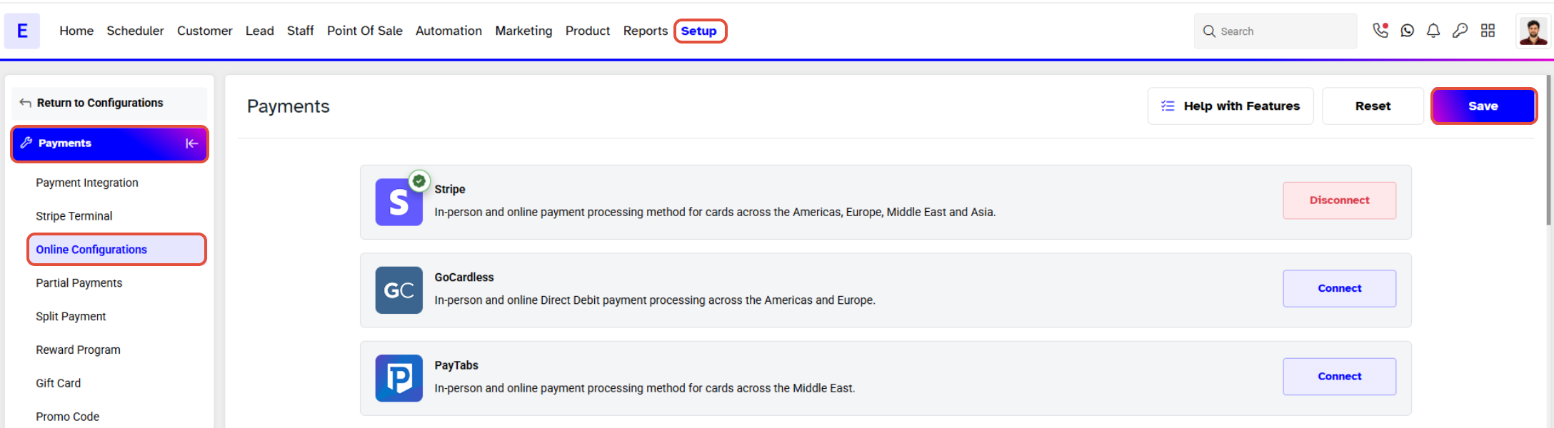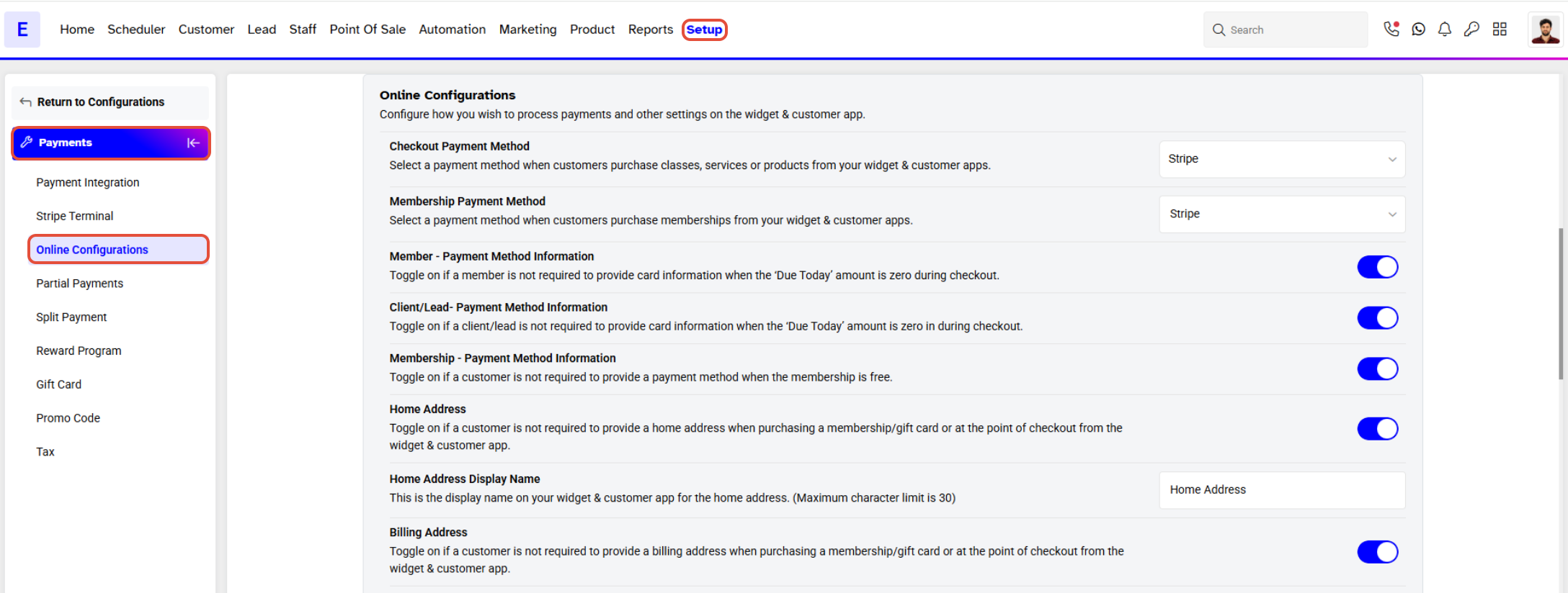 Whilst in Payments, scroll downwards to the Online Payment Configurations Section.