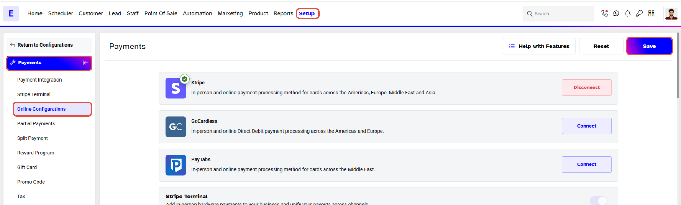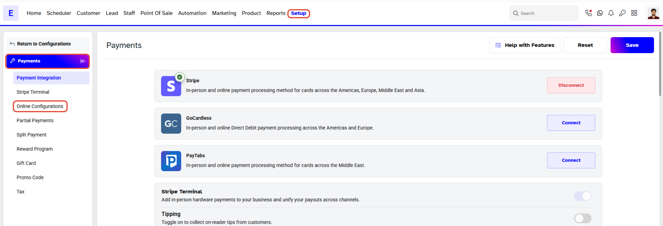 Whilst in Payments, scroll downwards to the Online Payment Configurations Section.