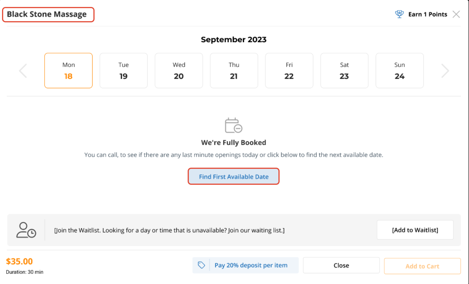 If the solt is not available. To find the First Available Slot, Customers simply need to click on the "Find First Available Date" option. This way, they won't have to manually navigate through different dates to find an available time slot.