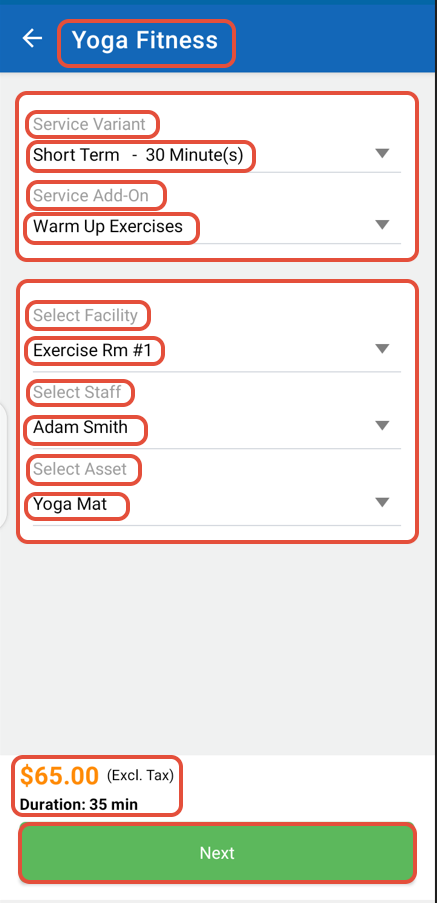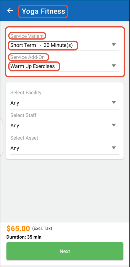 Choose the Service Variant and Service Add-On from the first section of the Service.