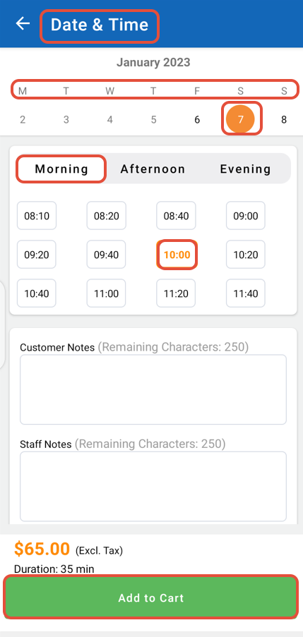 Choose the Day, Date, and Time Slot for the selected Service. Click on the Add to Cart Button to add Service to the Cart.