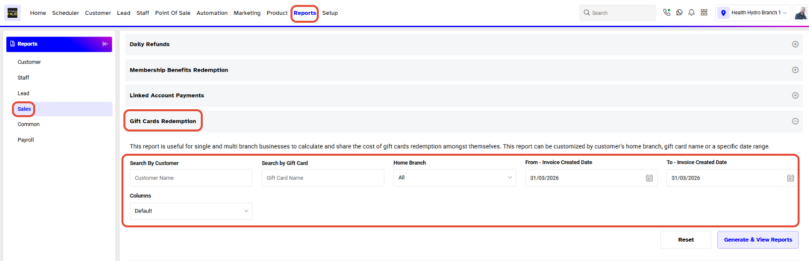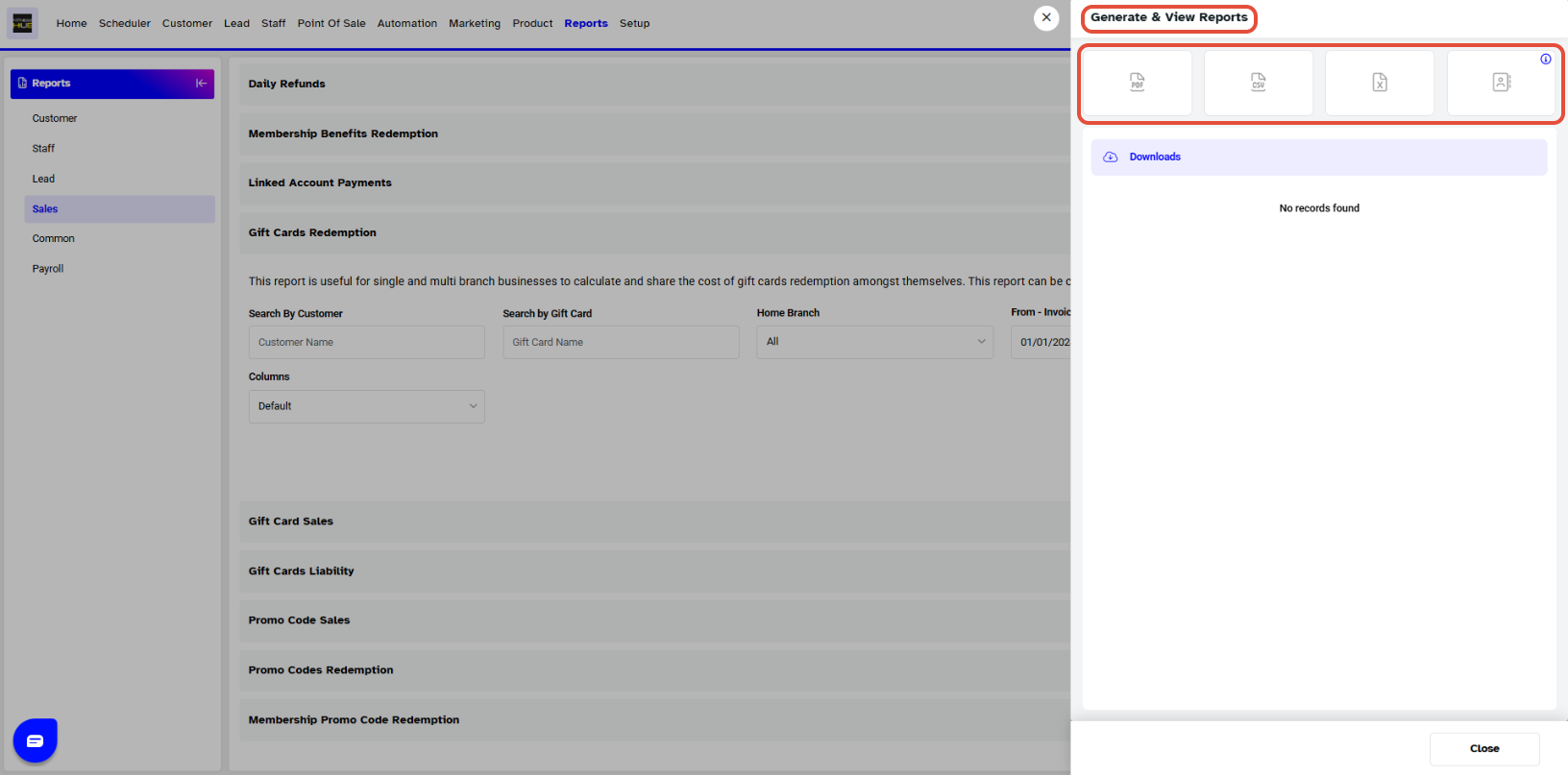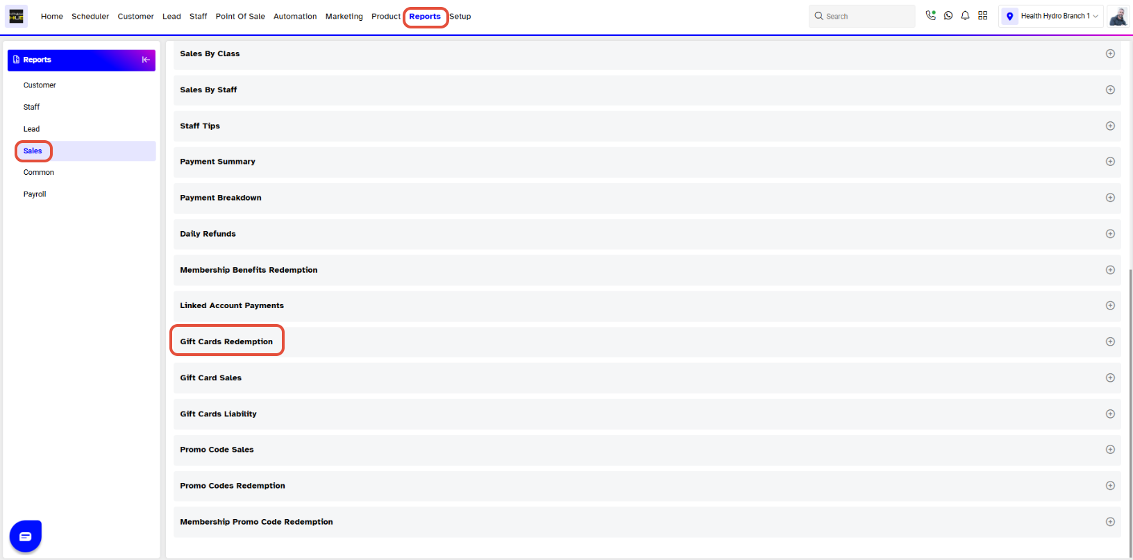 - Scroll down and click on the Gift Cards Redemption Report.