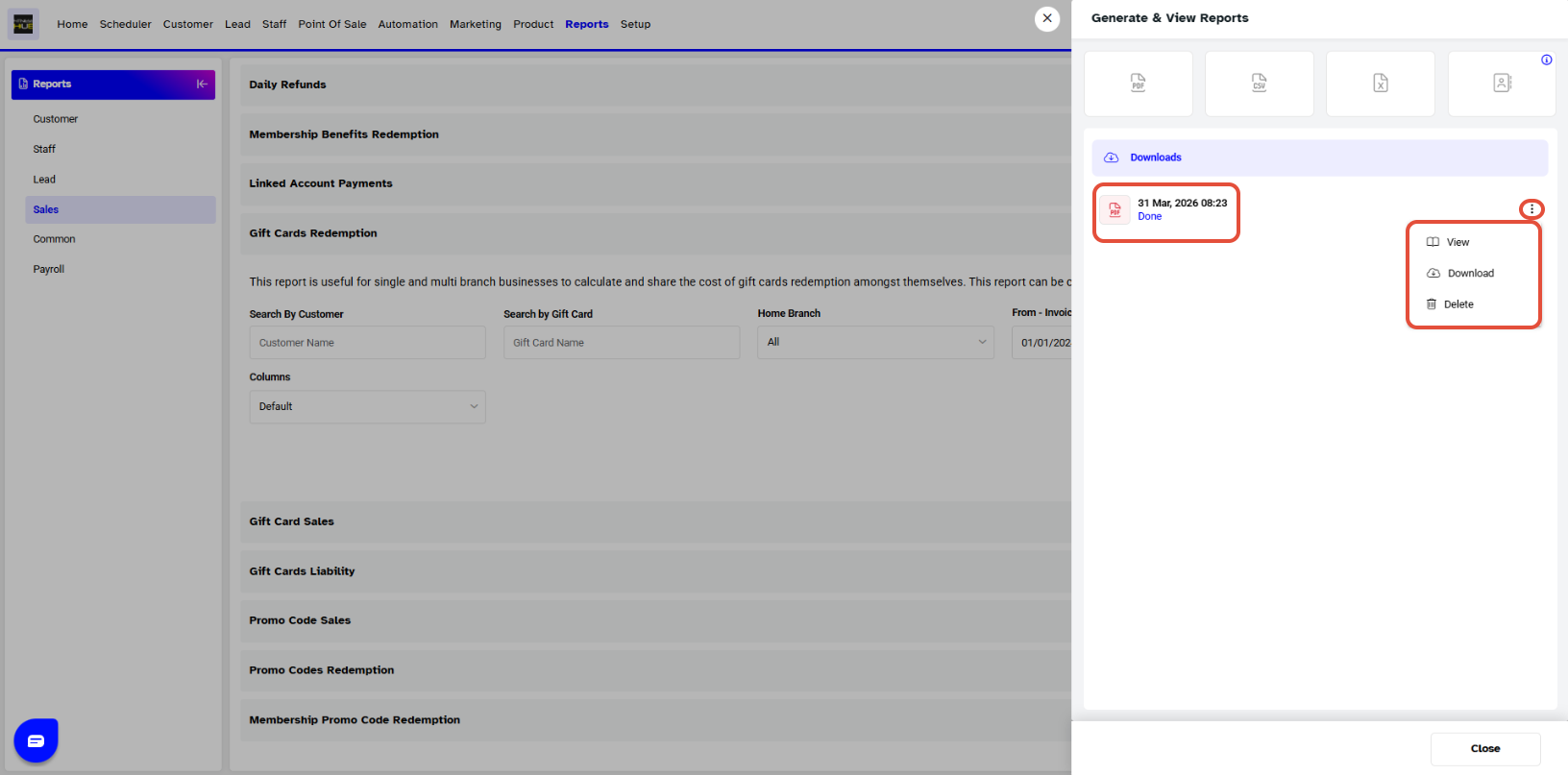 - Once generated, click the View icon to view the report or the Download button to save the Gift Cards Redemption Report.
