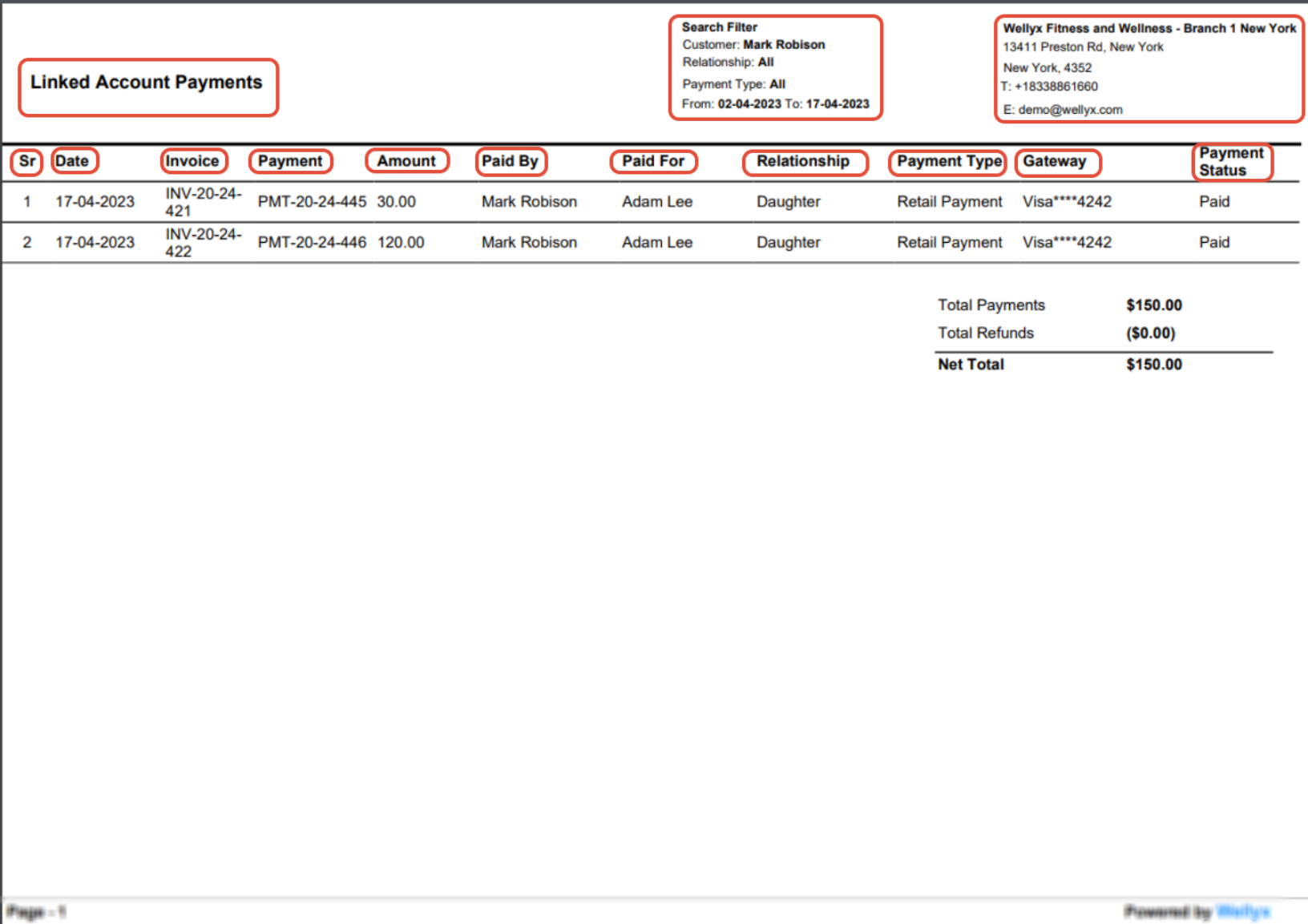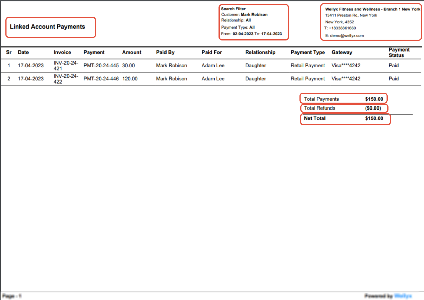 The Linked Account Payments Report also shows the Total Payments, Total Refunds, and Net Total.