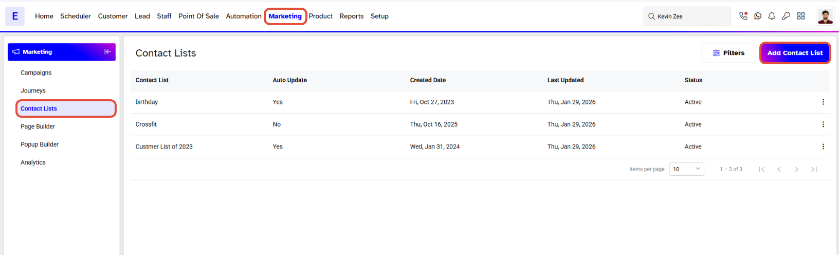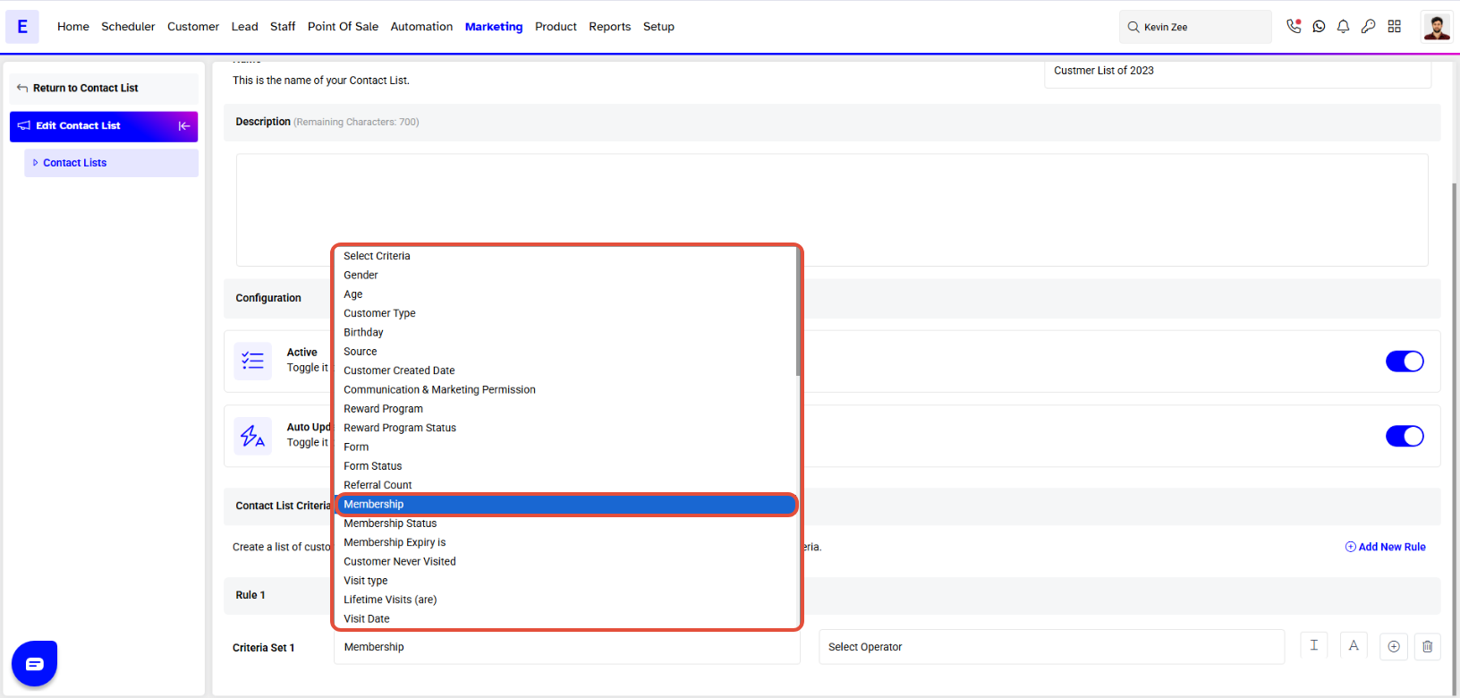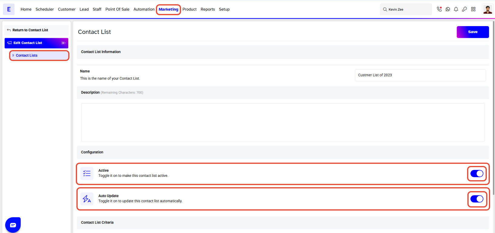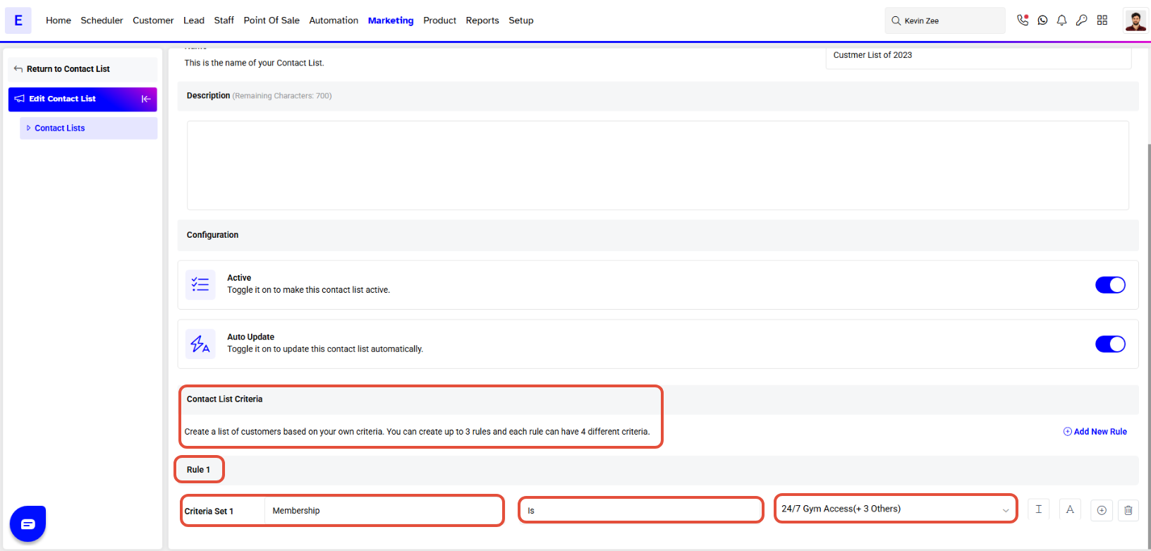 - Enable the Auto Update toggle to keep the Contact List updated based on the selected criteria.