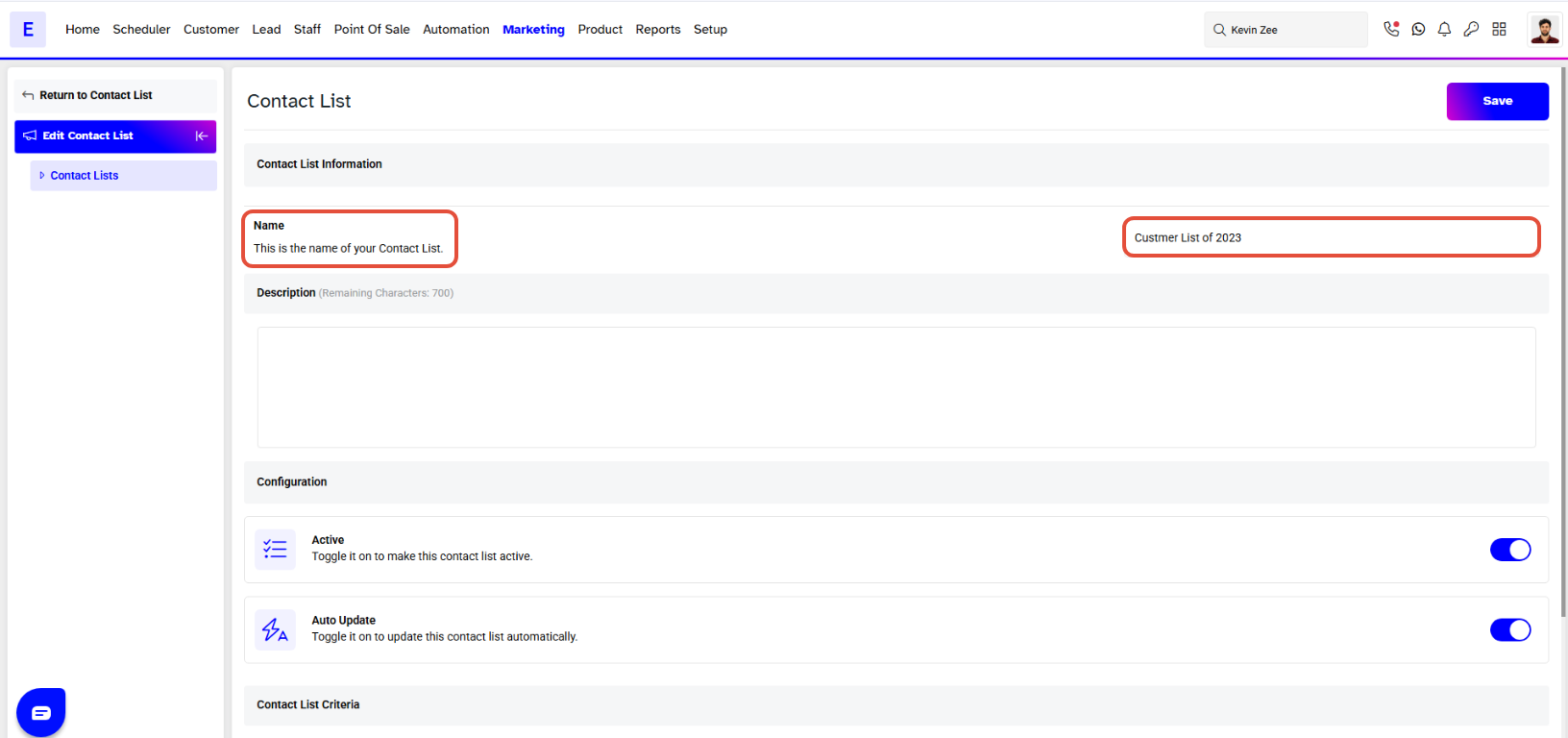- Name: Type the name of the Contact List.