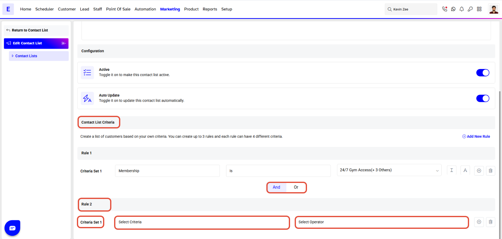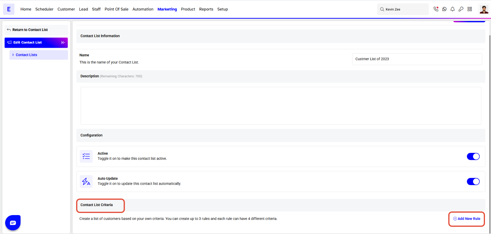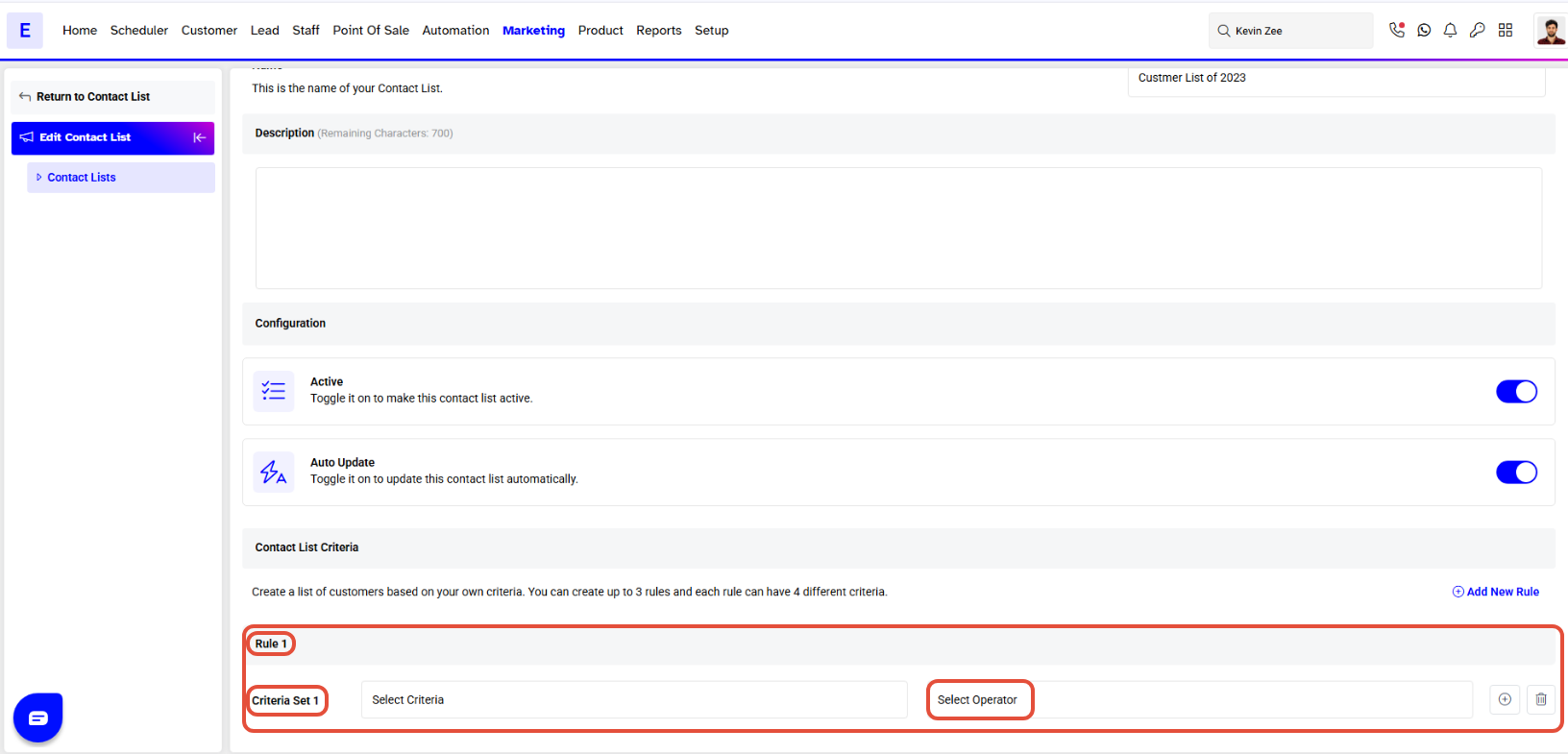 - Click on the Add New Rule Button to set the Customer Contact List Criteria.