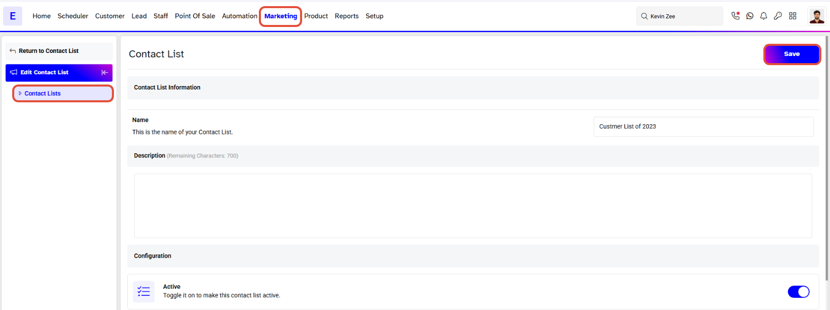 - Toggle on the Active button to activate the Contact List.