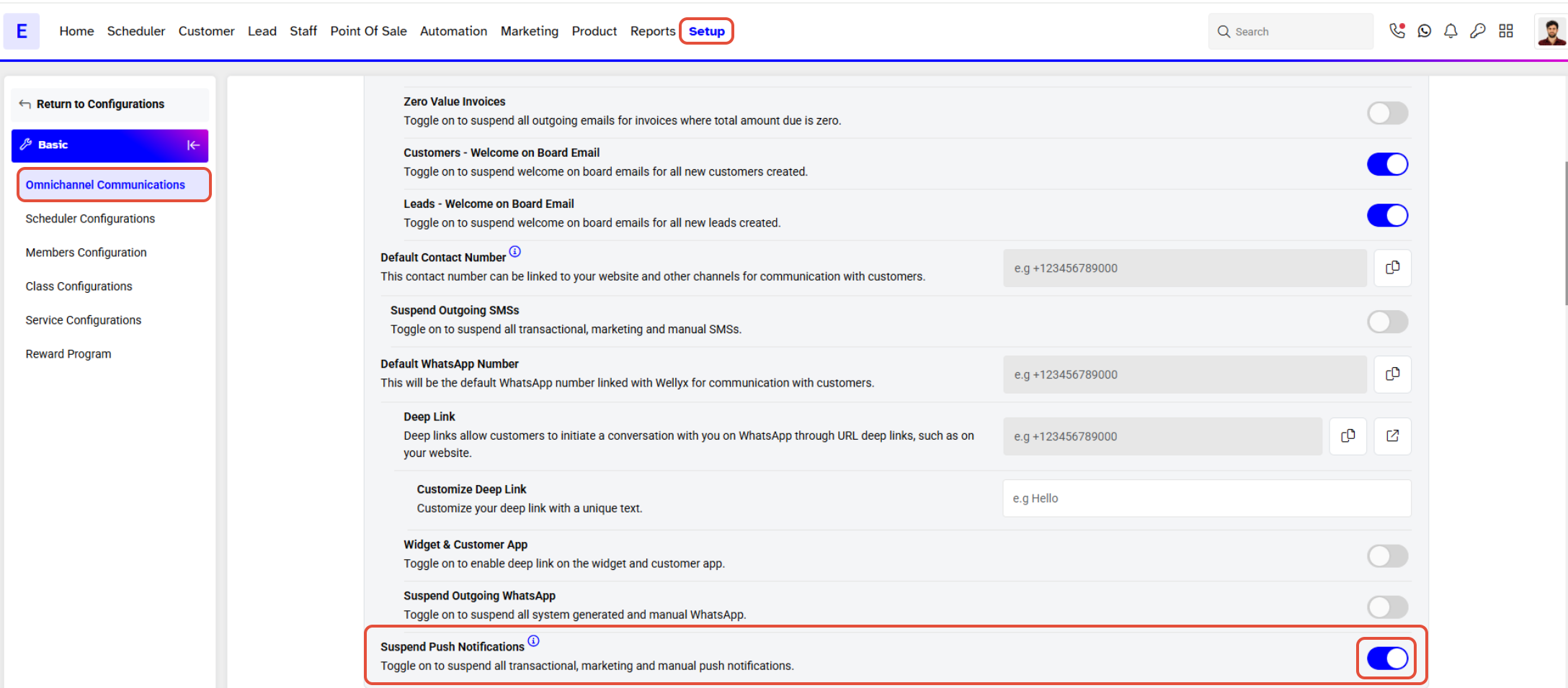 To stop sending out Push Notifications, toggle on the Suspend Push Notification Button.