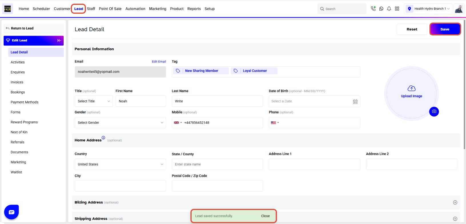 - The Lead Profile has been Saved successfully.