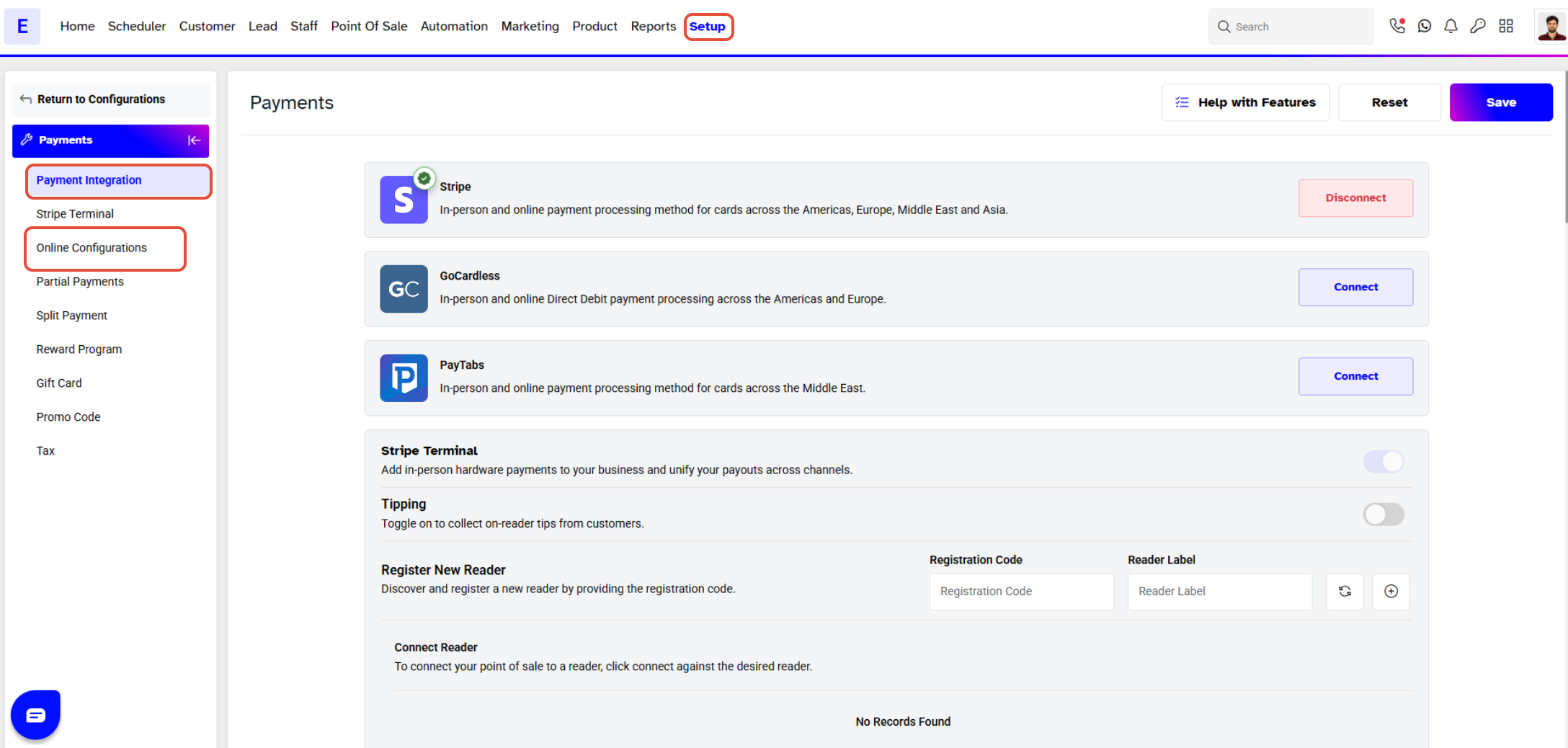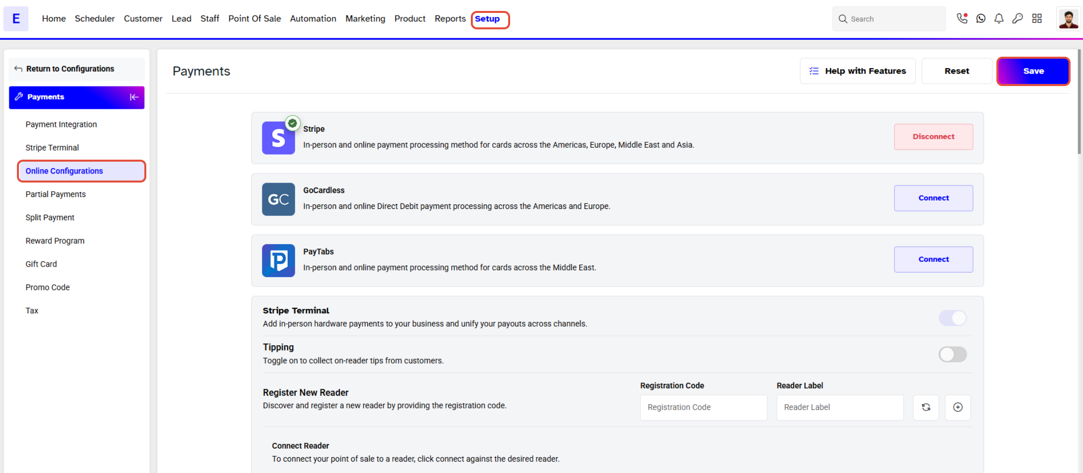 Whilst in Payments, scroll downwards to the Online Payment Configurations Section.