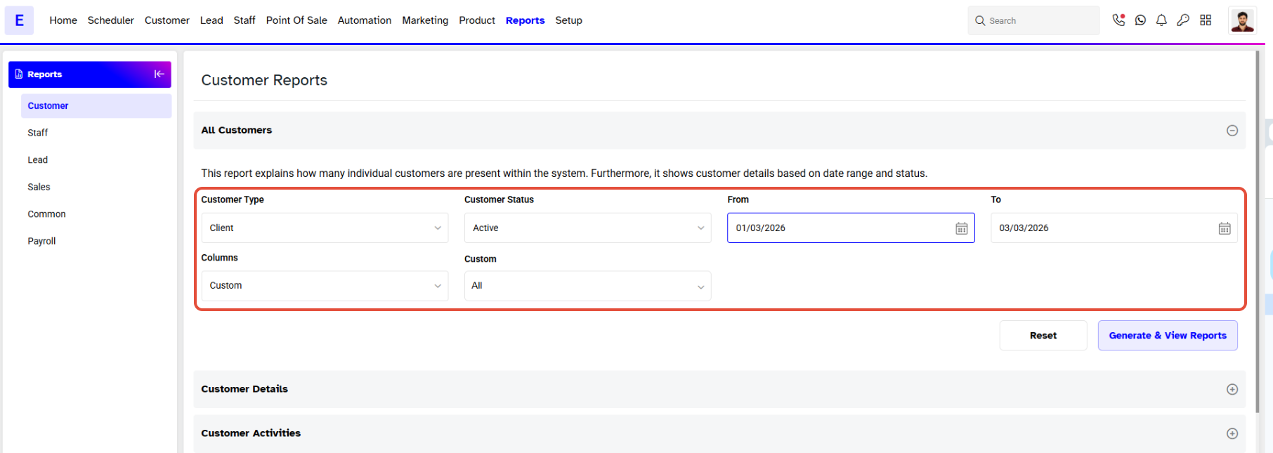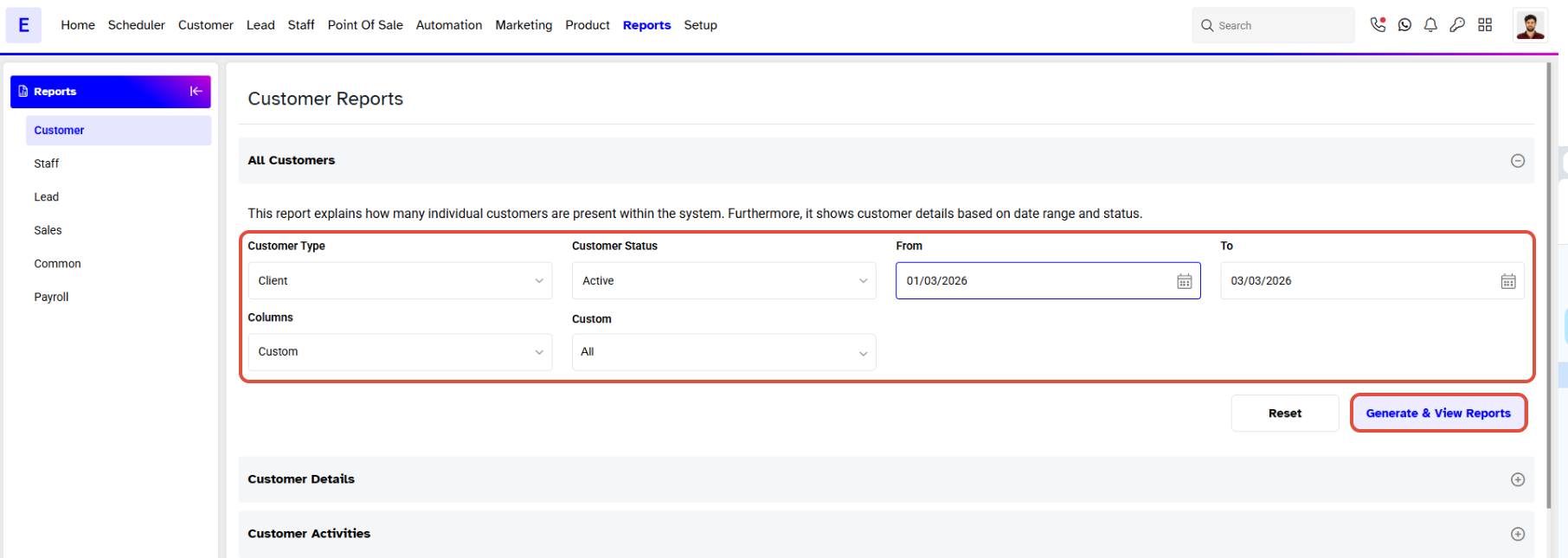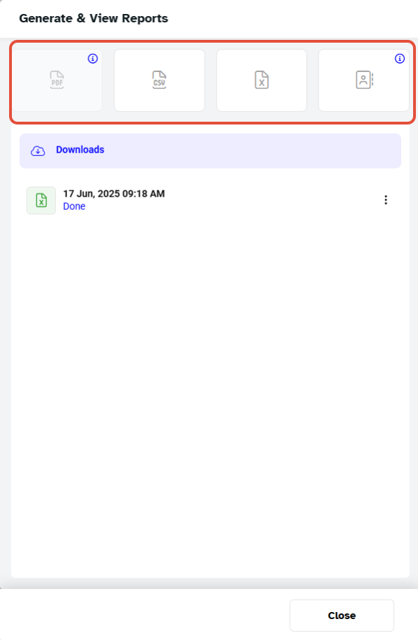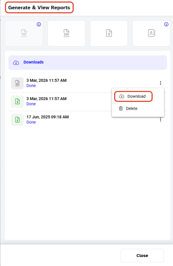 - To generate the Report, select PDF, CSV, Excel, or Contact List for download.
