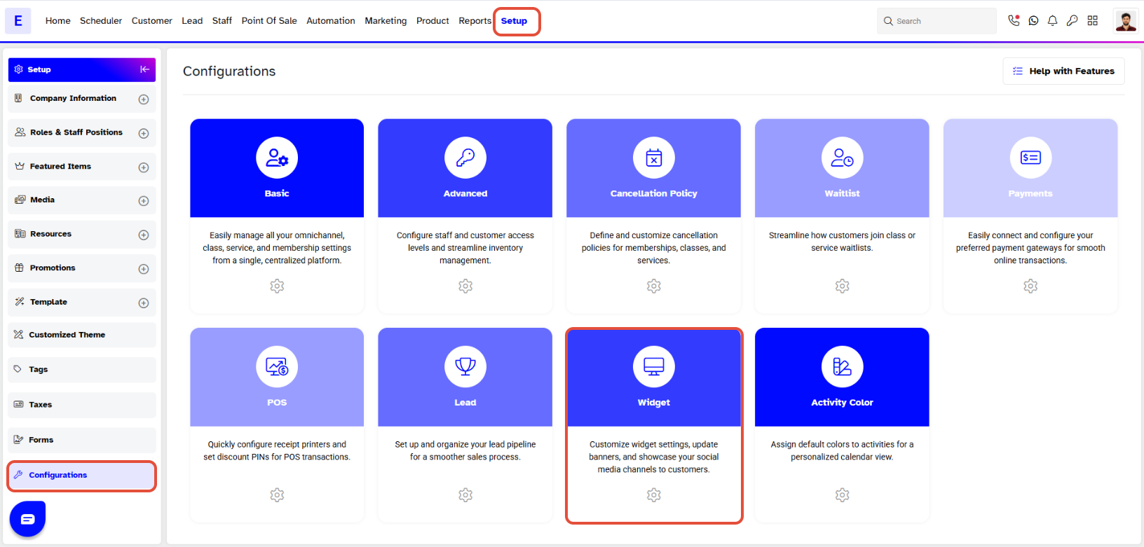 Merchants can extend their software through the Widget Module, to provide their customers with functionalities such as; Online Bookings, Reviewing Membership Benefits, Promoting Specialized offers and more special features.