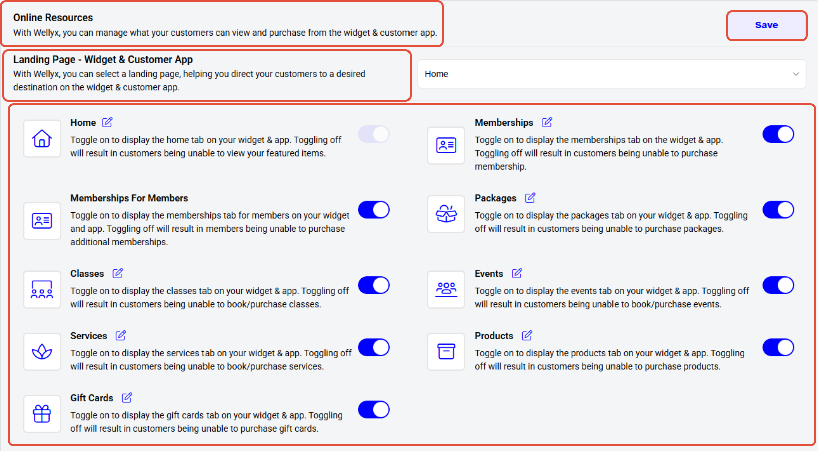 By Toggle on/off the Classes, Membership, Products, Gift Cards and Services you can publish and unpublish the resources on the Merchant's site (Widget & Customer App).