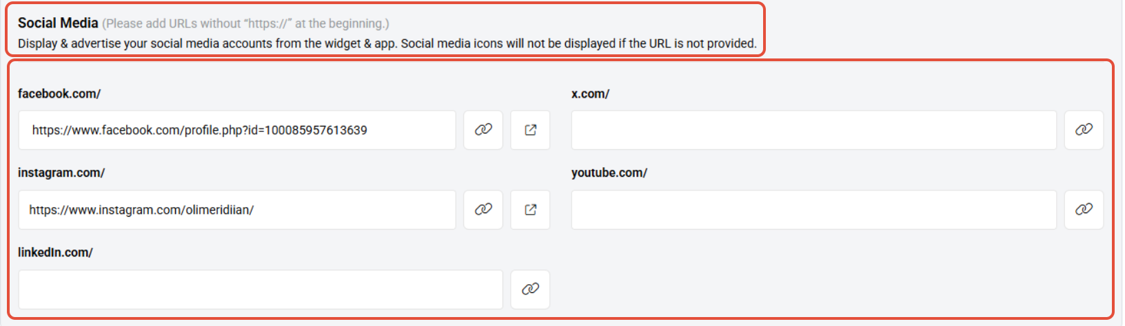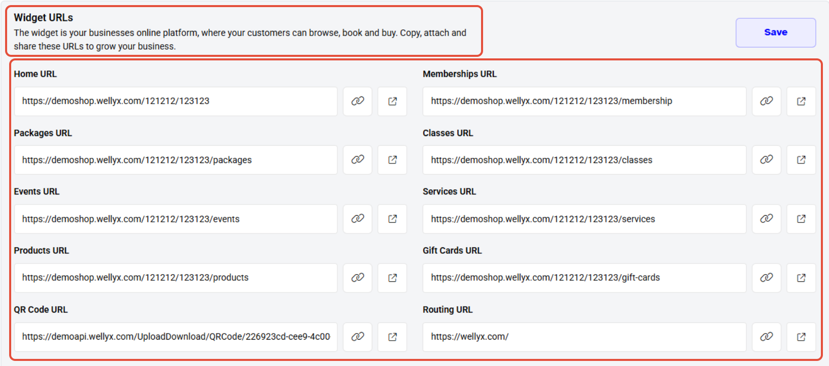- In the Widget URL section, provide quick links to your sites