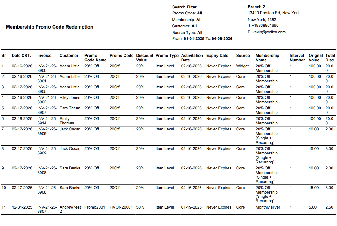 The Membership Promo Code Redemption Report displays a list of members who have purchased memberships by applying a promo code. This report contains the following information: