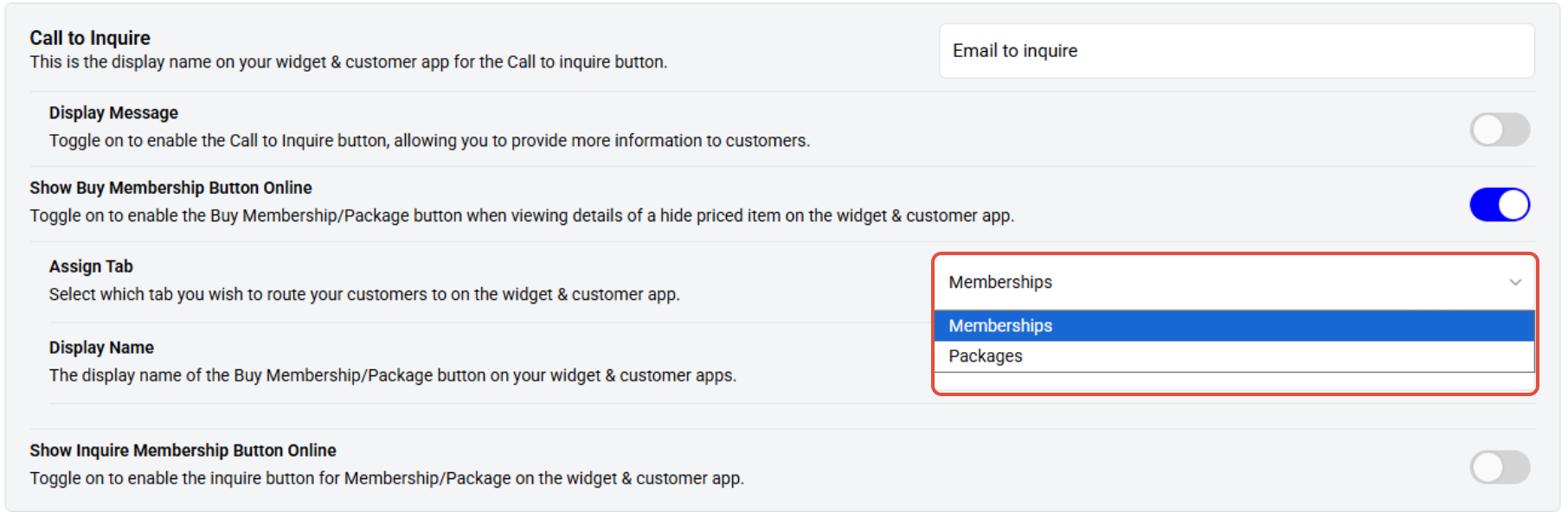 An additional Buy Membership Button appears under Call to Inquire Button in Core, allowing Customers to view the Buy Membership/Package Button for Items with Hidden Prices on the Widget and Customer App. This Button directs Customers to the Membership or Packages Tab.