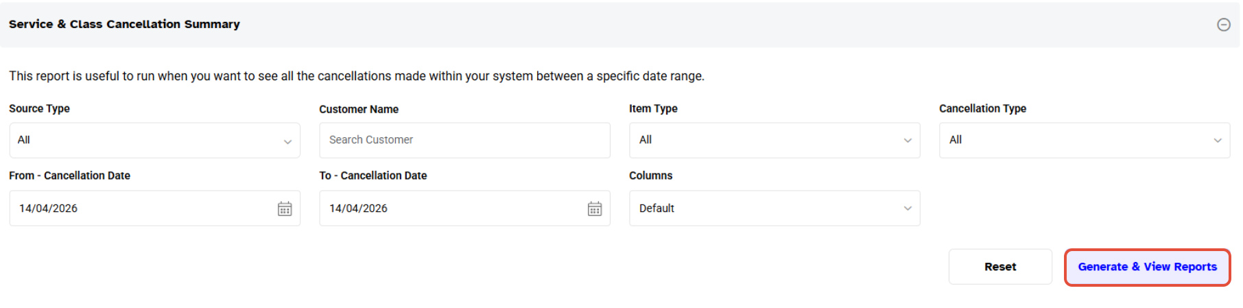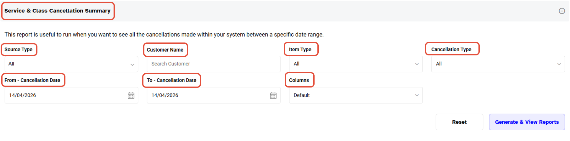 The Service & Class Cancellation Summary Report will display the following fields.
