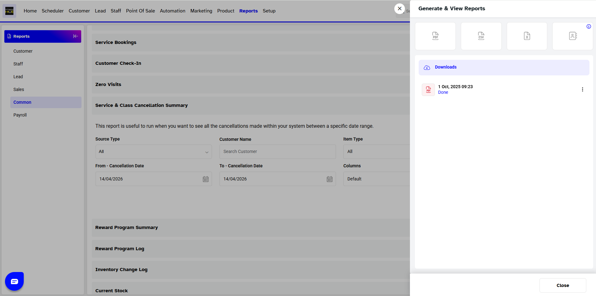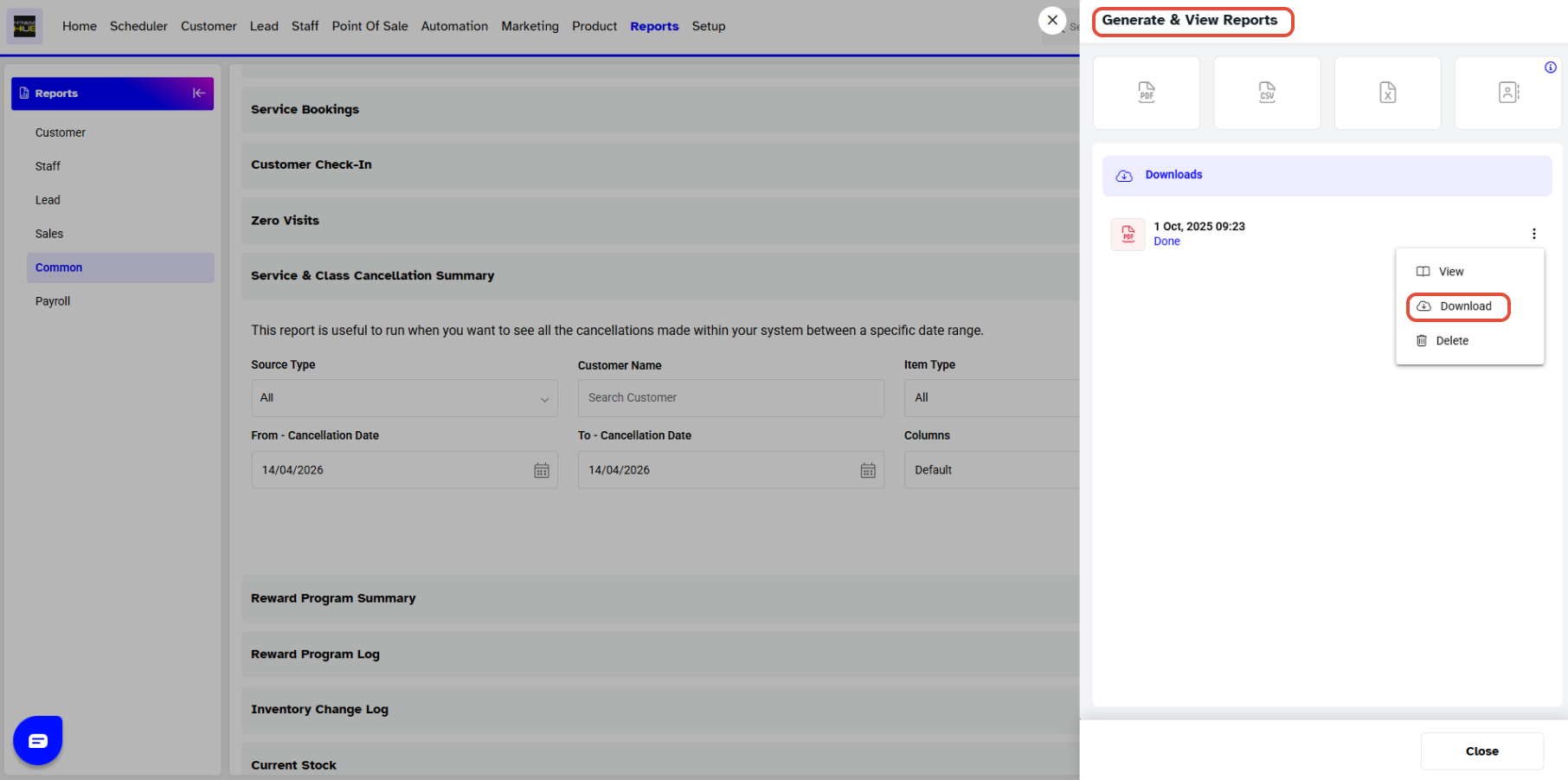 Once the Service & Class Cancellation Report has been generated, it will appear on the screen, and you can view and download it again using the action buttons