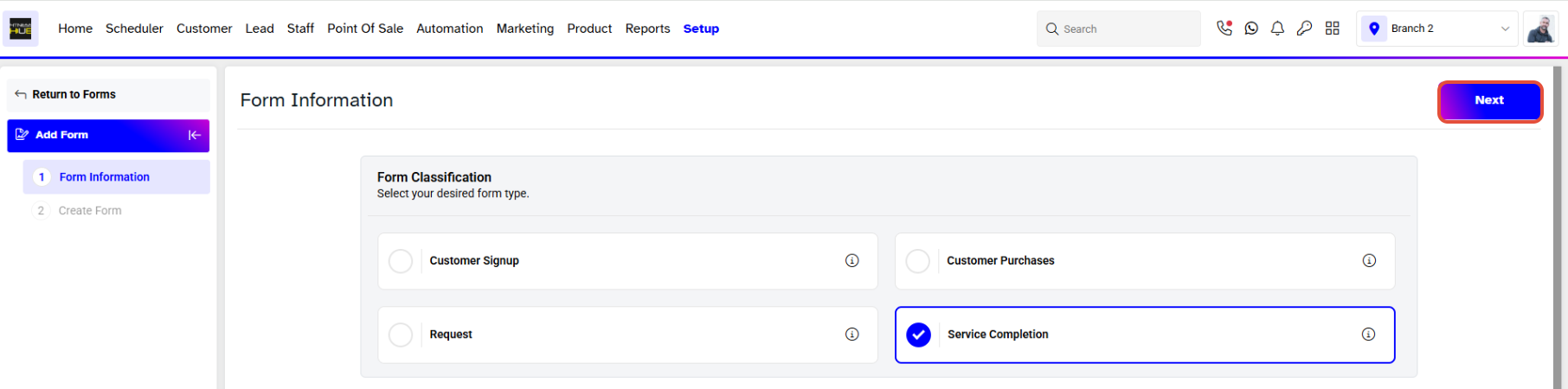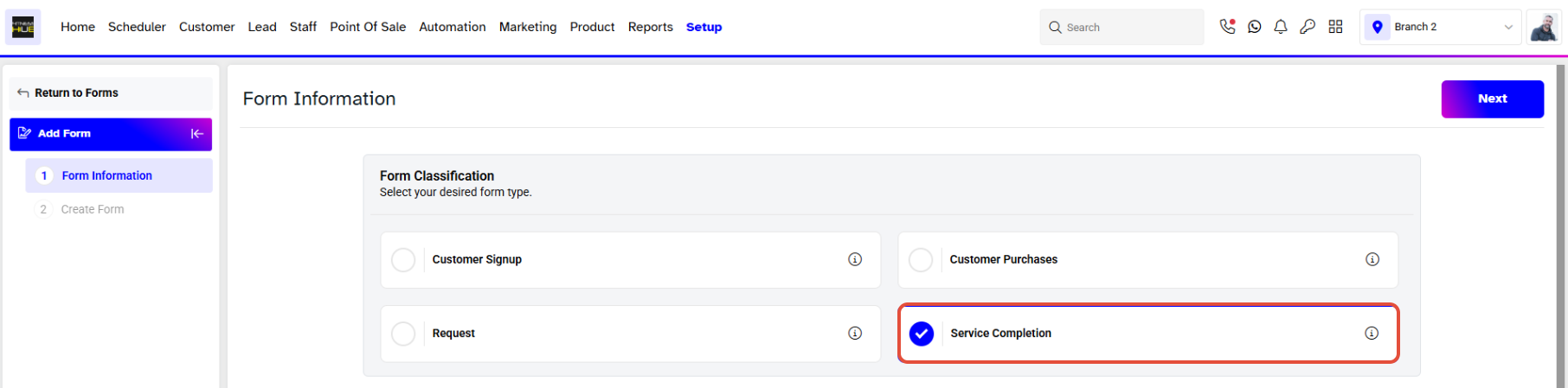 Select "Require Form on Service Completion" as the form type.