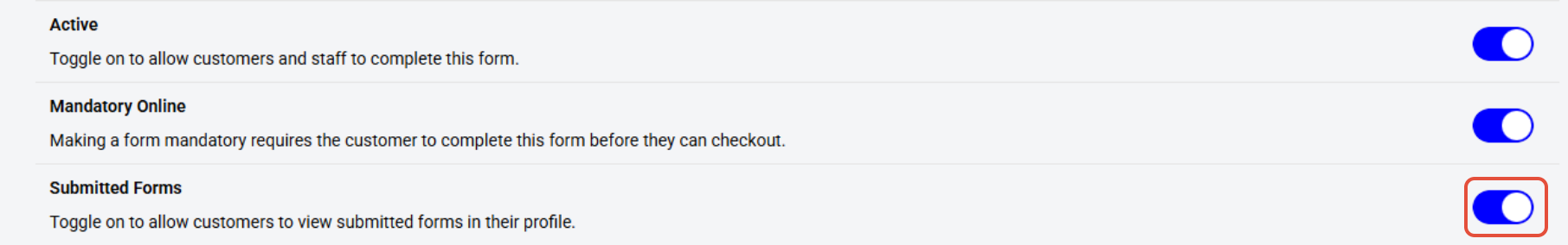Show Submitted Forms: This toggle allows the customer to view submitted forms in their profile.