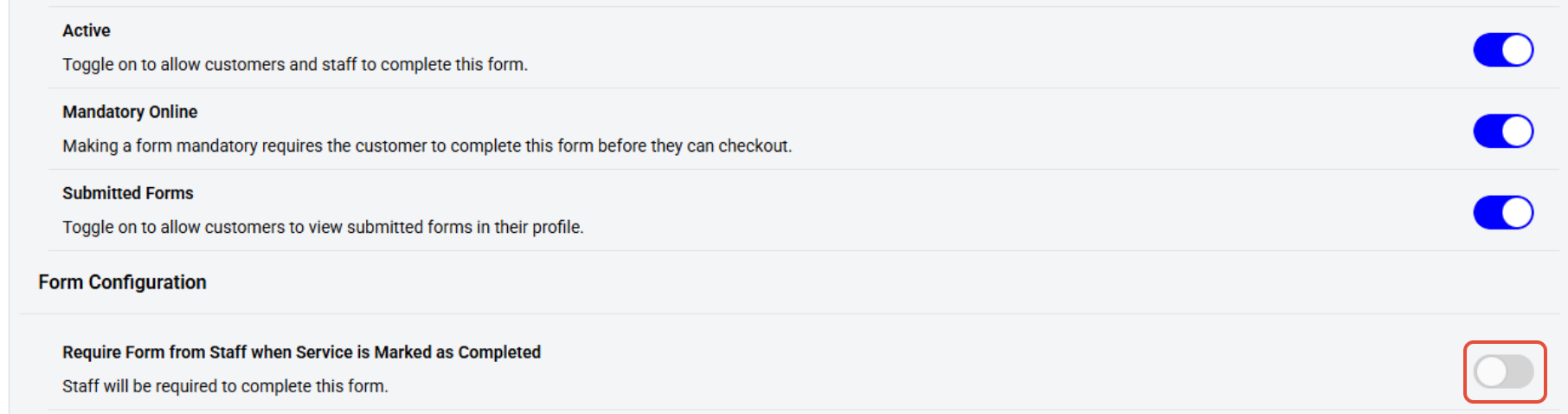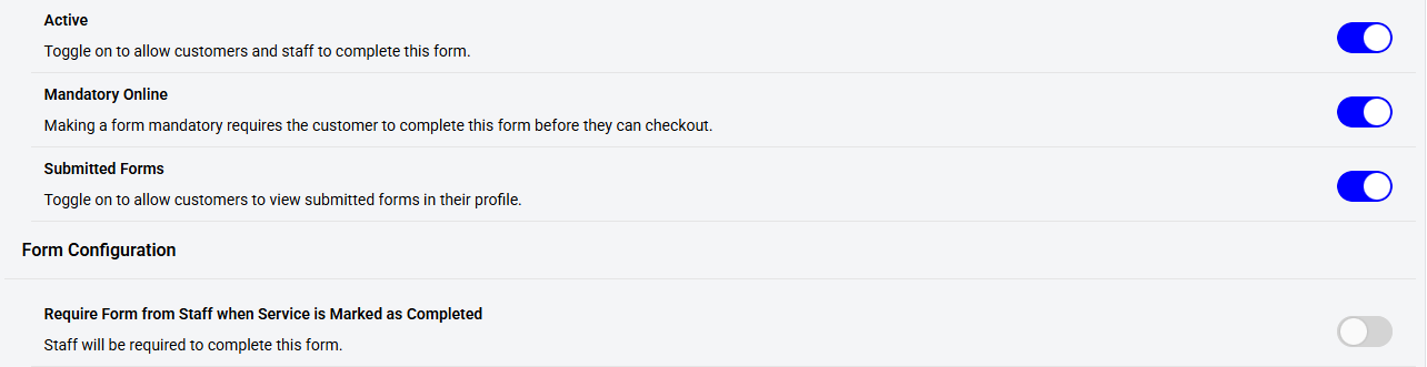 Require Form from Staff: This toggle determines if the related staff must fill out the form when the service is marked as completed.