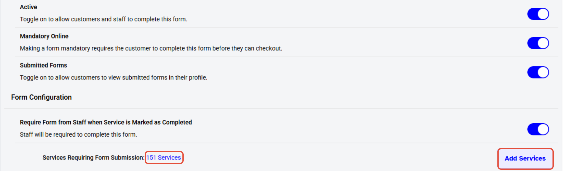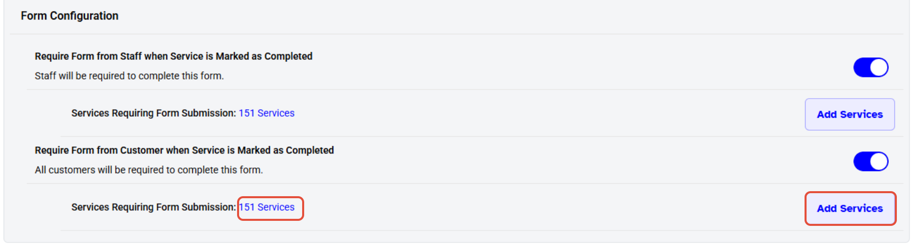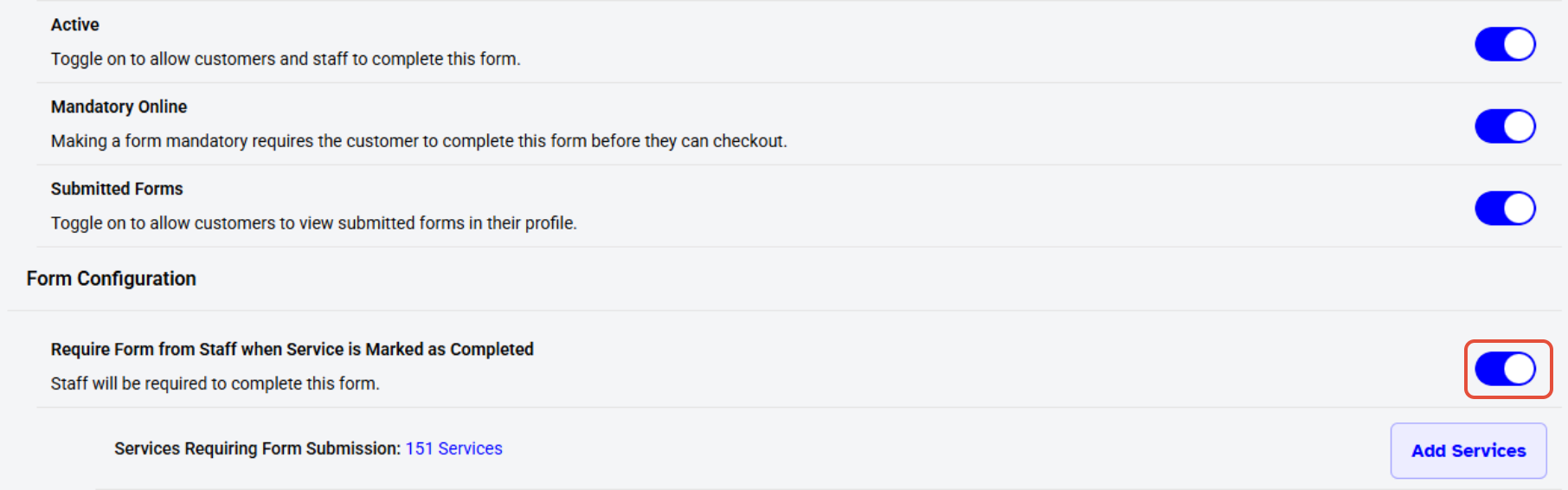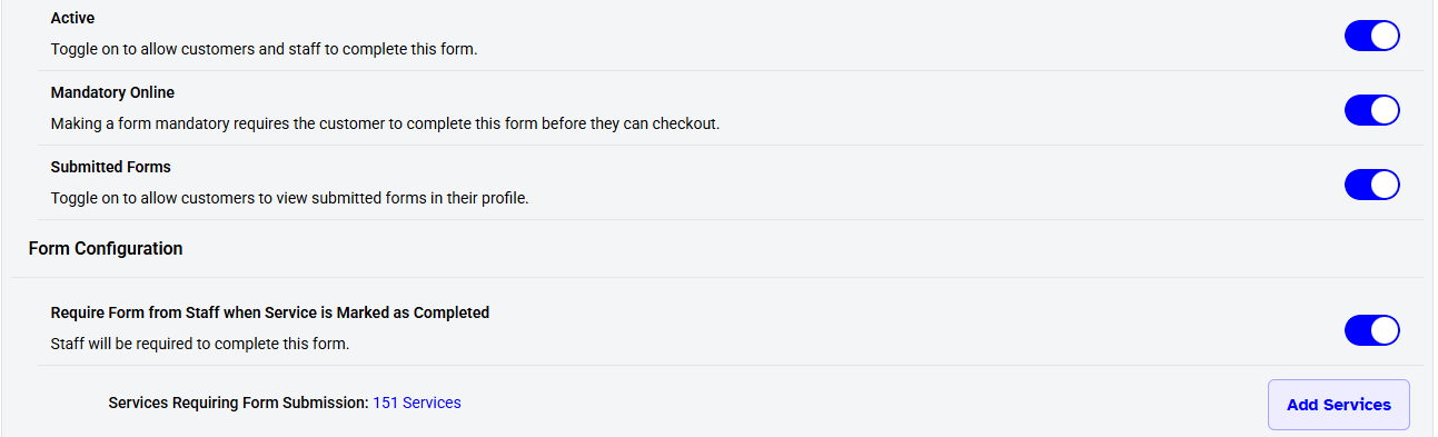 When the "Require Form from Staff" toggle is turned on, the "Services Requiring Form Submission" option will appear.